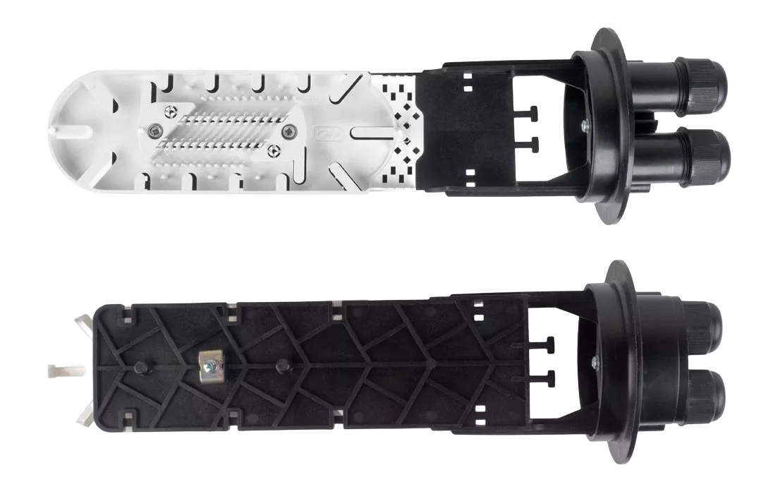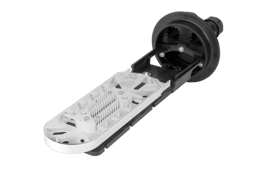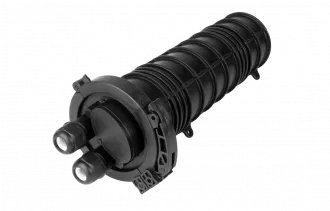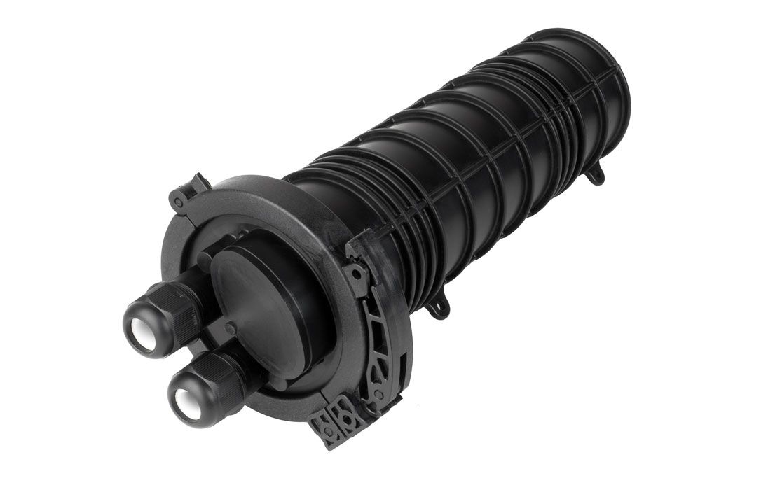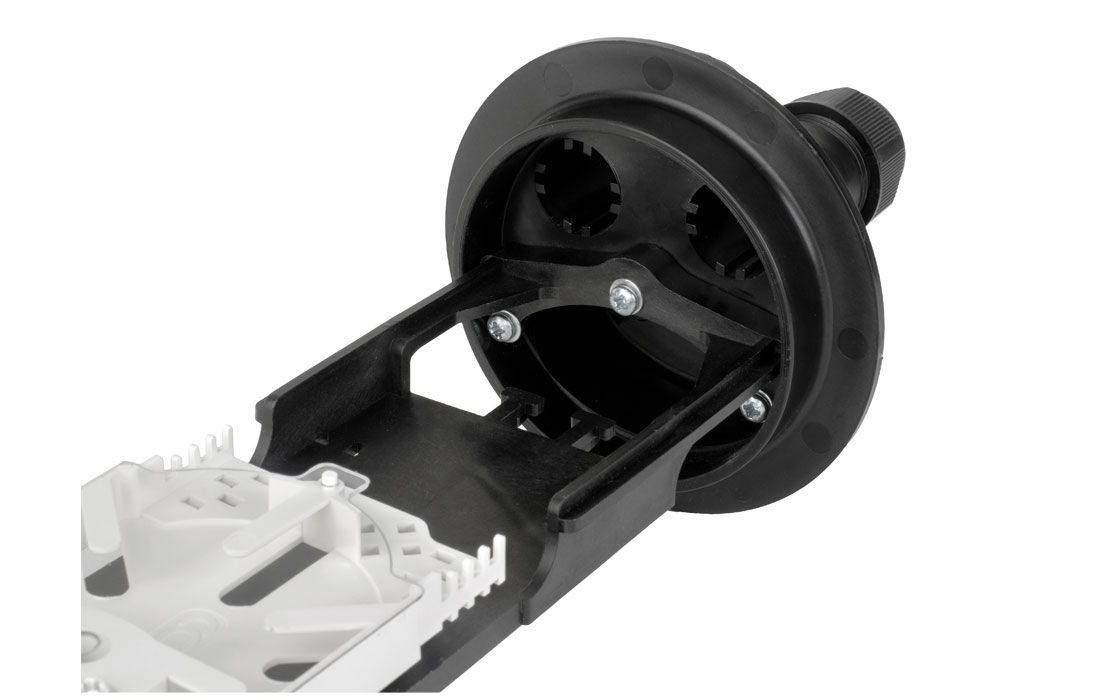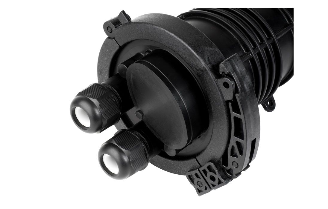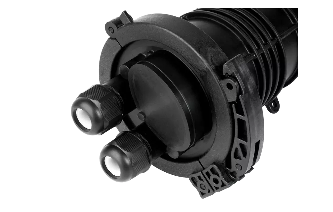 Ввод кабеля, крепление и герметизация осуществляется с помощью резьбовых фитингов, отлитых непосредственно на оголовнике муфты. Муфта имеет два круглых патрубка с фитингами и один овальный, герметизация вводимых кабелей осуществляется также механическим способом. Используя специальные комплекты для ввода в овальный патрубок можно ввести как два отдельных кабеля, так и транзитный. Заглушка овального ввода выламывается при помощи молотка.