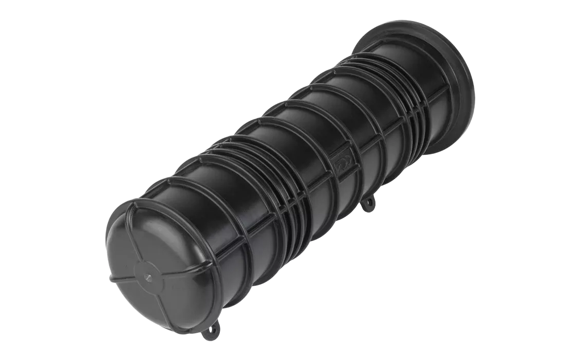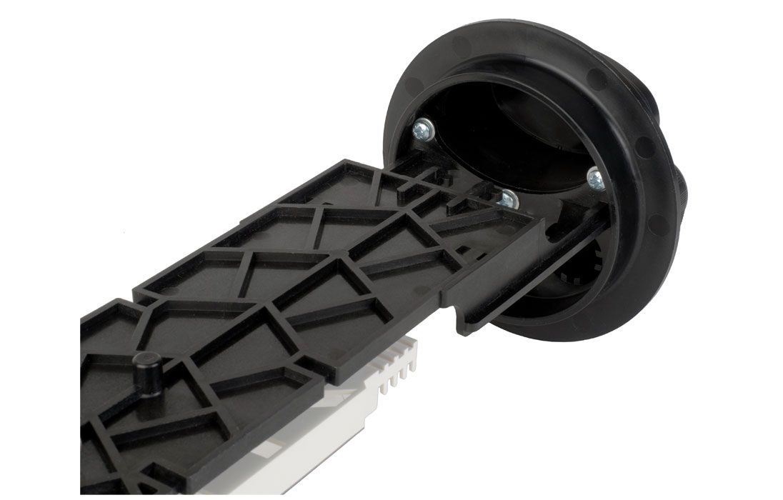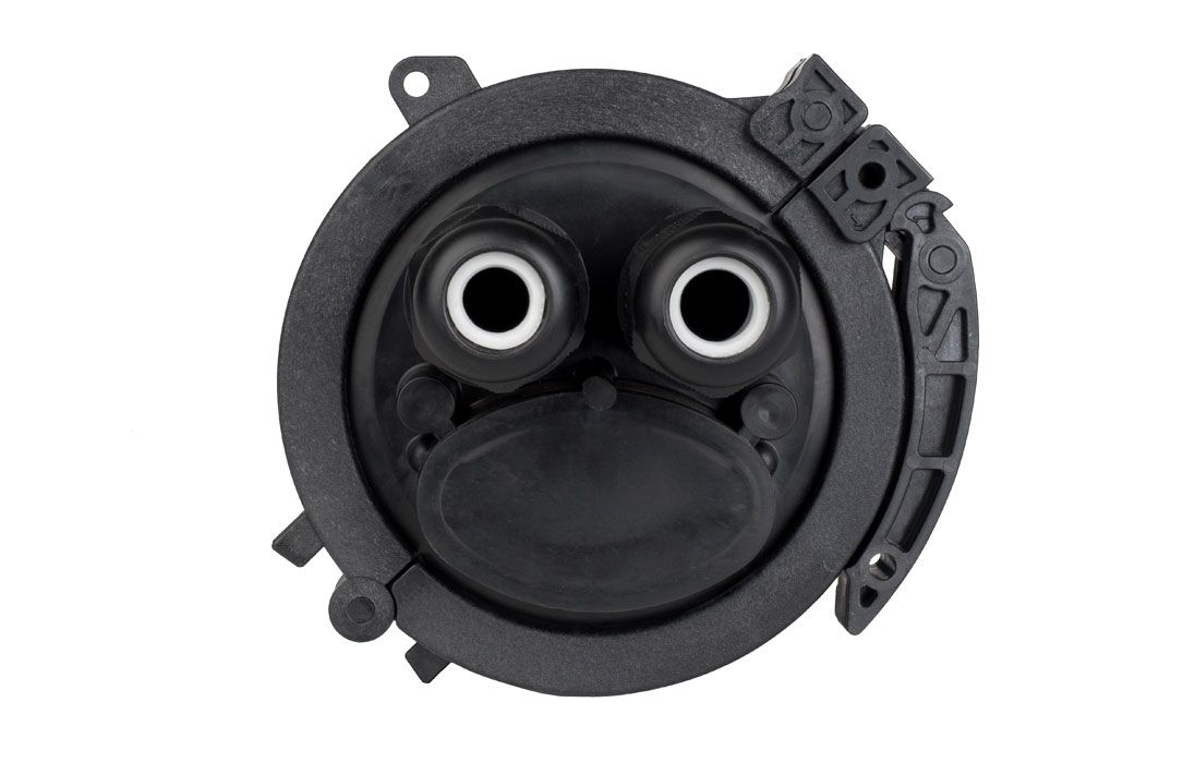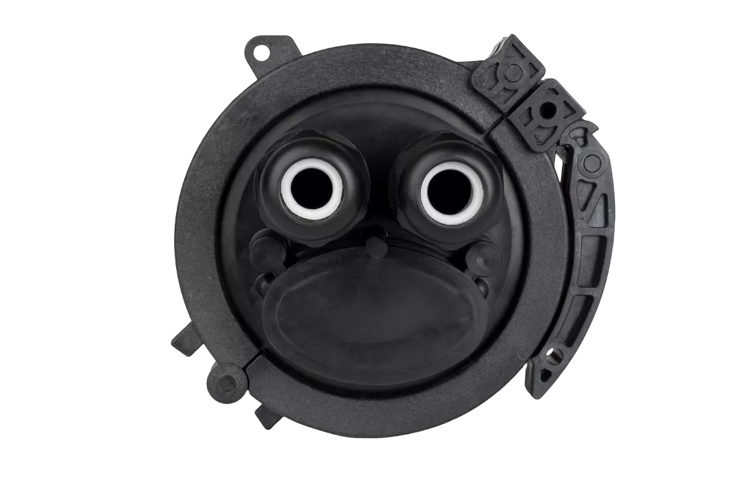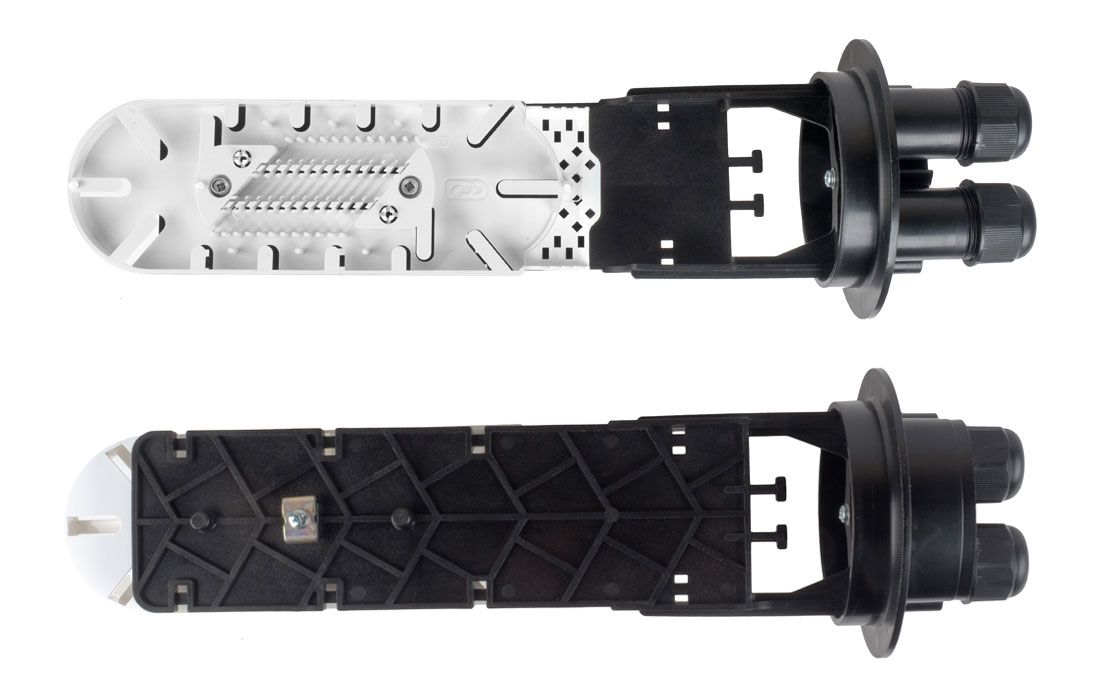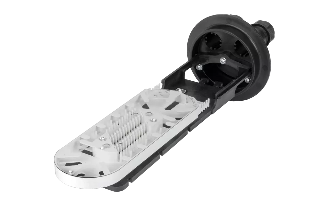 Ввод кабеля, крепление и герметизация осуществляется с помощью резьбовых фитингов, отлитых непосредственно на оголовнике муфты. Муфта имеет два круглых патрубка с фитингами и один овальный, герметизация вводимых кабелей осуществляется также механическим способом. Используя специальные комплекты для ввода в овальный патрубок можно ввести как два отдельных кабеля, так и транзитный. Заглушка овального ввода выламывается при помощи молотка.