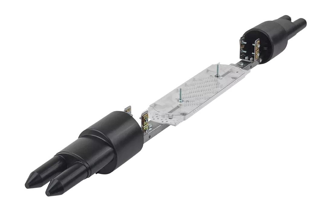В муфте предусмотрено два овальных ввода. Таким образом, муфта может одновременно использоваться для ввода транзитной петли кабеля и ввода двух кабелей диаметром до 25 мм. В обоих случаях для герметизации необходимо дополнительно приобрести «Ввод №6».