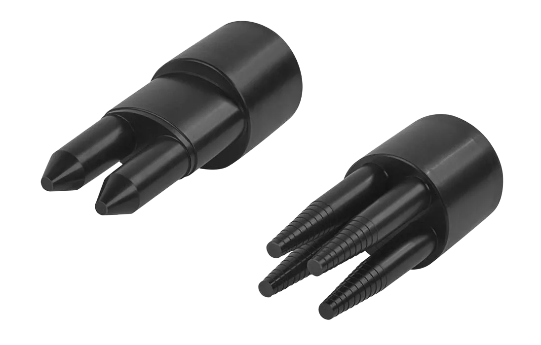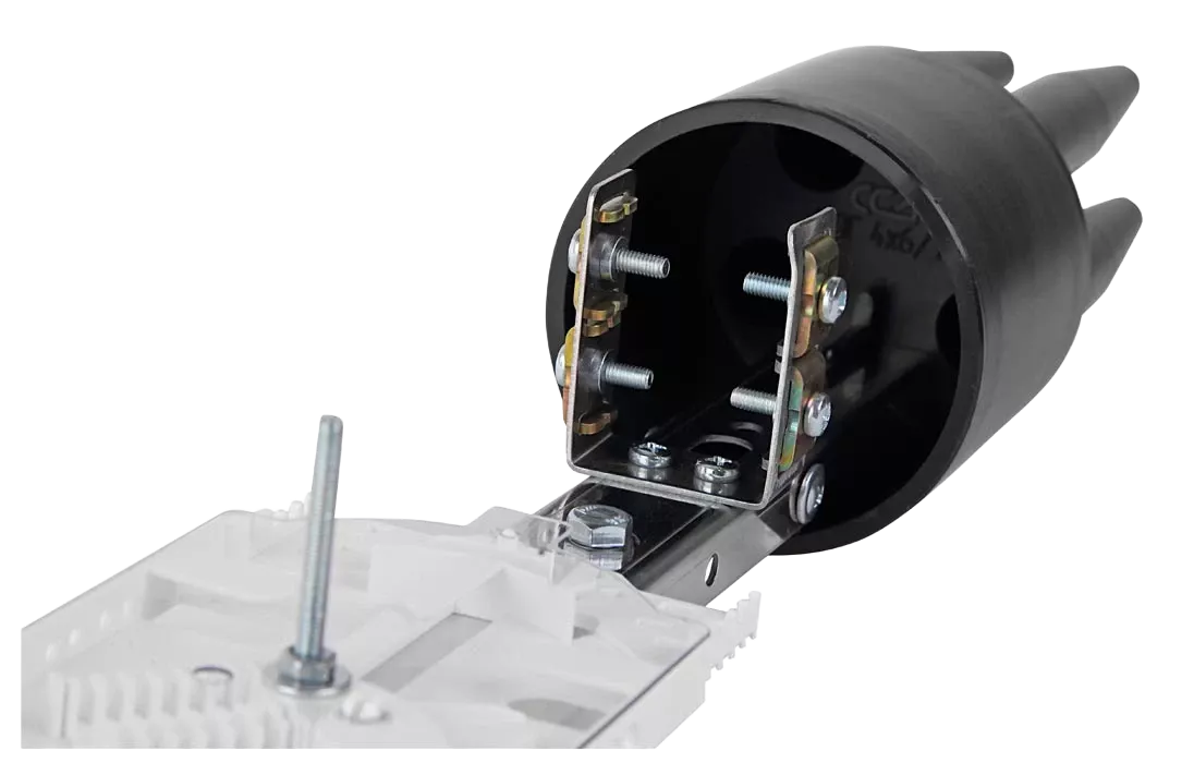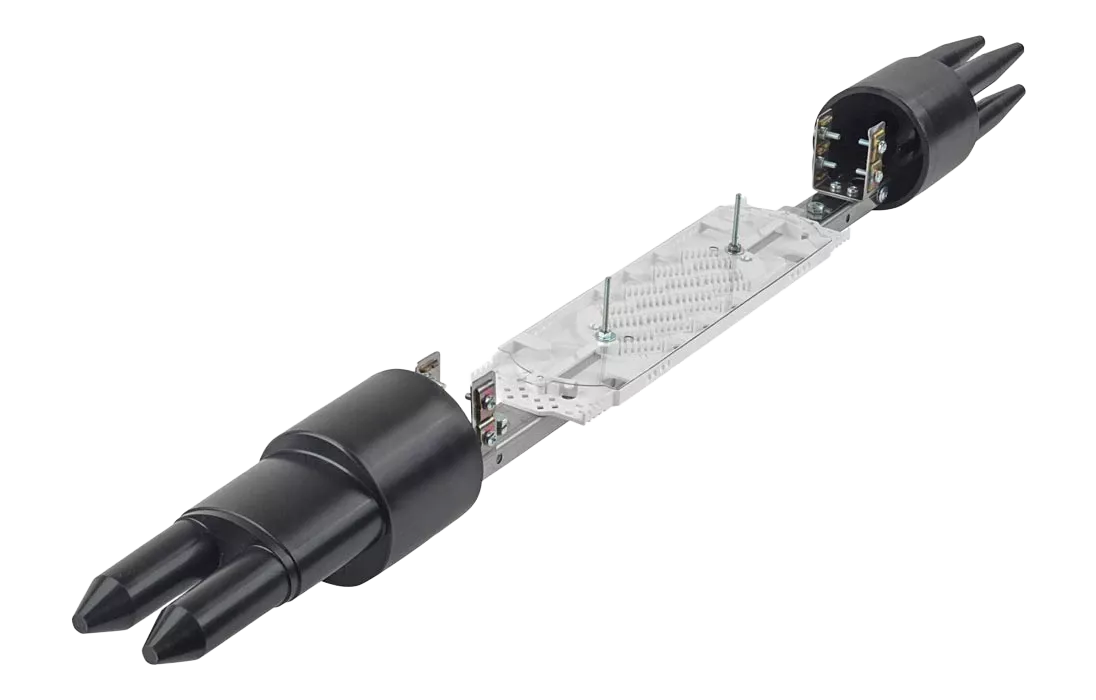 Способ герметизации вводов кабелей, осуществляется с помощью термоусаживаемых трубок ТУТ. Круглые патрубки на оголовнике муфты изначально герметичны и имеют ступенчатую форму с разными диаметрами. Срезая патрубок в определенном месте можно подобрать отверстие максимально близкое к диаметру вводимого кабеля. Таким образом, исключается излишнее натяжение ТУТ после усадки при вводе относительно тонких кабелей. Все патрубки муфты оснащены также индивидуальными узлами крепления ЦСЭ.