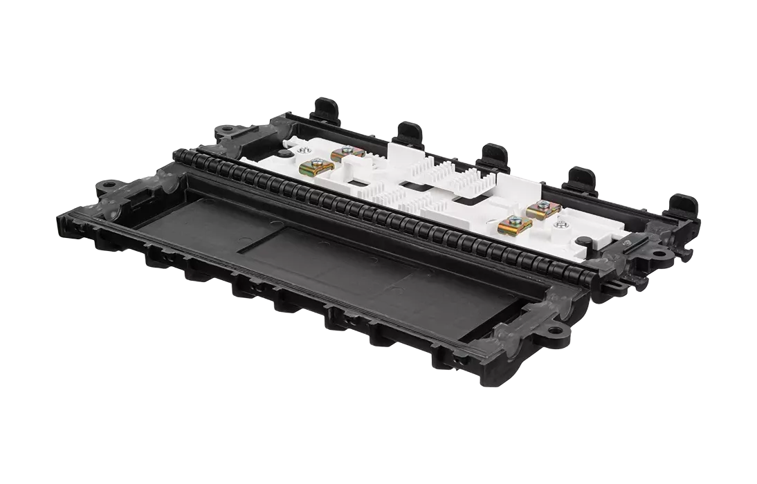 По периметру корпуса муфты, в местах соприкосновения с крышкой, находится эластичный гелевый уплотнитель, с помощью которого осуществляются как герметизация корпуса, так и герметизация введенных кабелей.