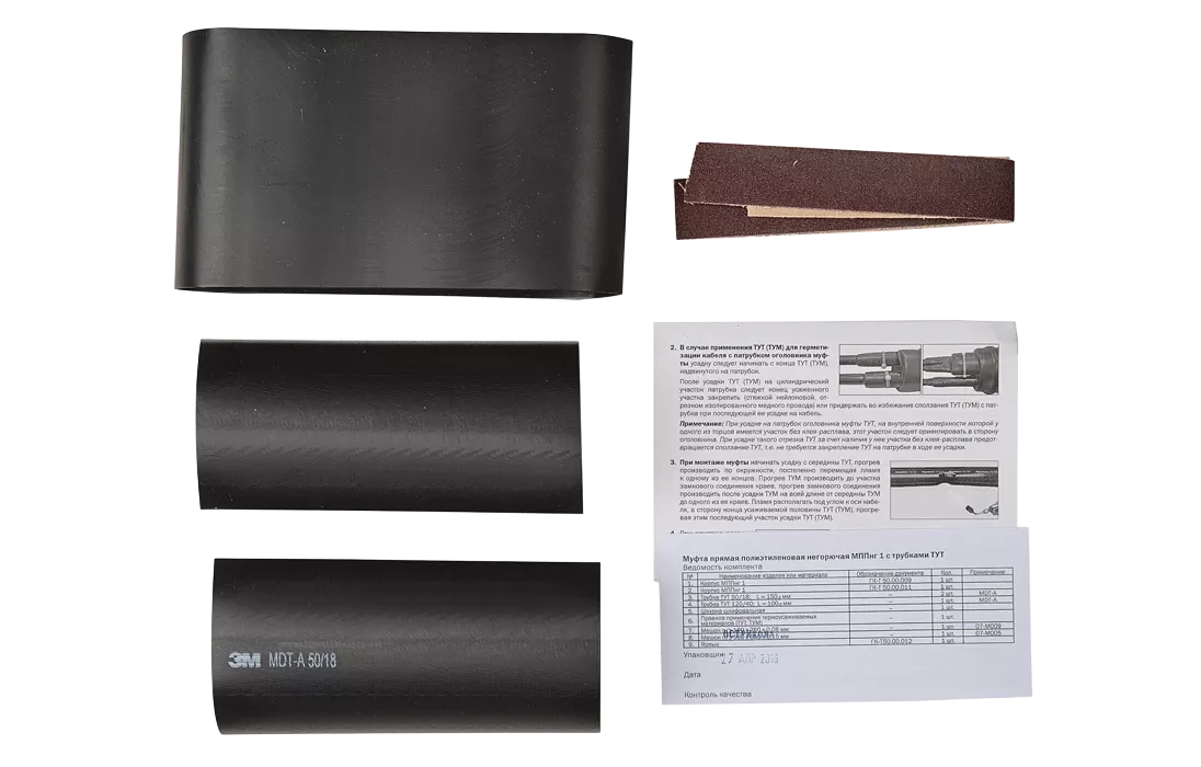 В комплект входят корпус муфты и отрезки трубок ТУТ, подобранные с учётом диаметров частей муфты и диаметров оболочек сращиваемых кабелей. Комплект позволяет выполнить только одну монтажную операцию – герметизацию муфты. Для выполнения остальных монтажных операций, таких как сращивание жил, восстановление экрана, восстановление поясной изоляции, следует дополнительно приобретать расходные материалы.