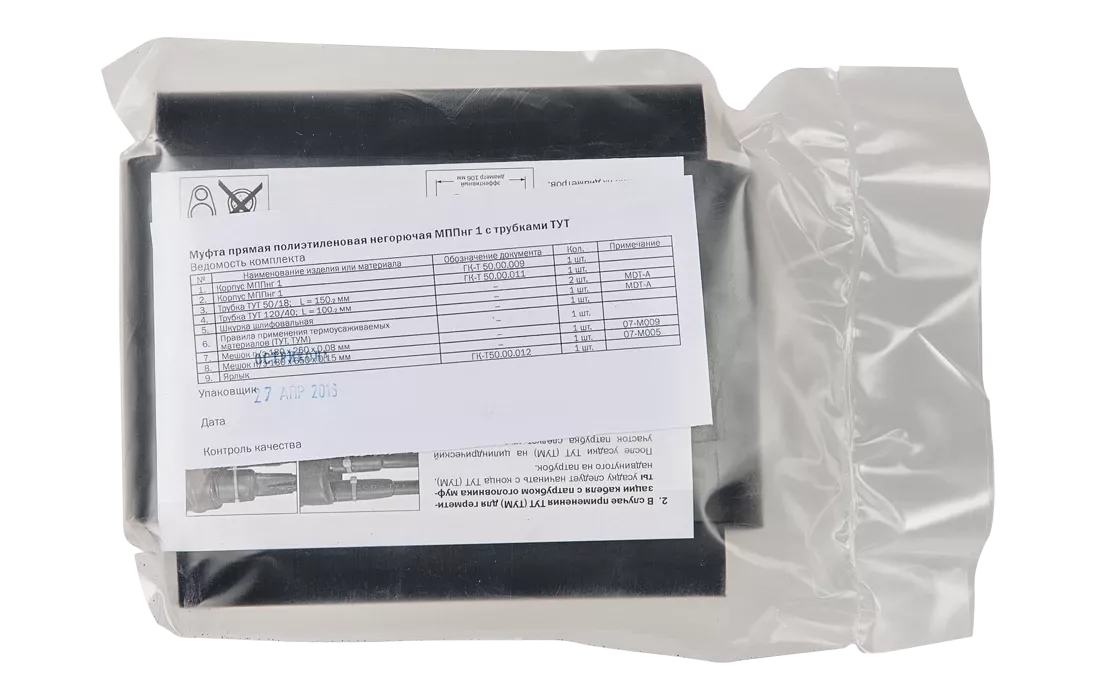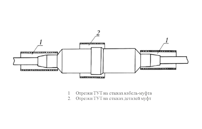В комплект входят корпус муфты и отрезки трубок ТУТ, подобранные с учётом диаметров частей муфты и диаметров оболочек сращиваемых кабелей. Комплект позволяет выполнить только одну монтажную операцию – герметизацию муфты. Для выполнения остальных монтажных операций, таких как сращивание жил, восстановление экрана, восстановление поясной изоляции, следует дополнительно приобретать расходные материалы.