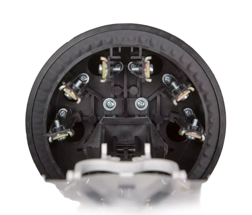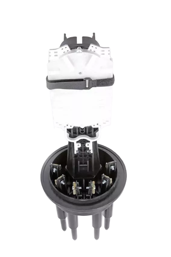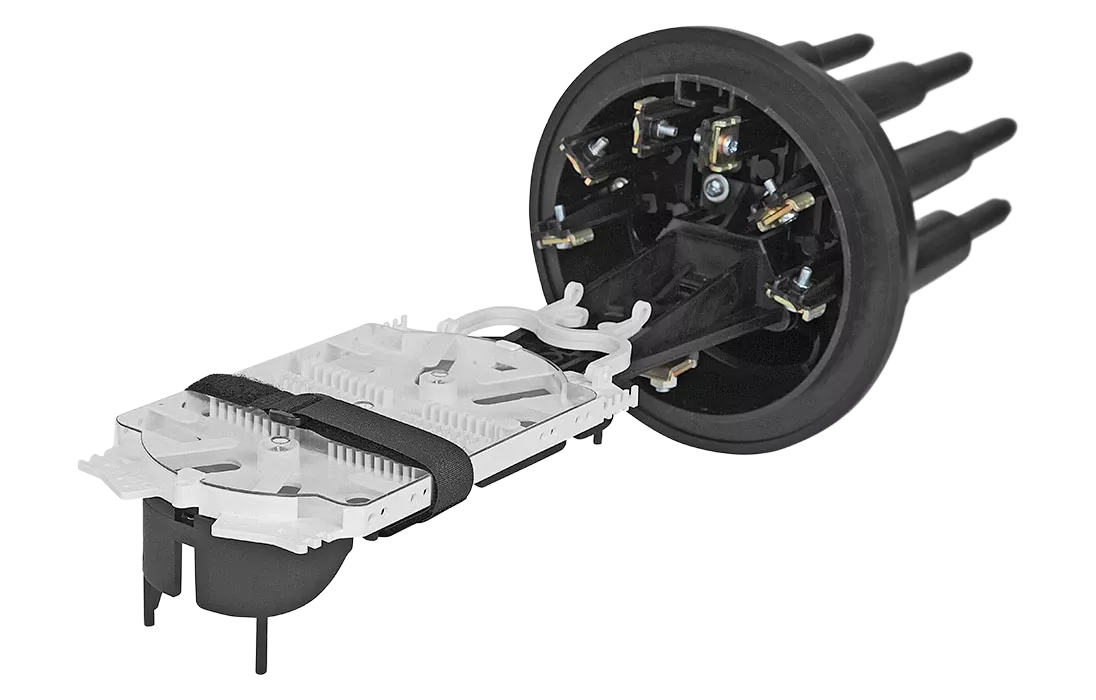 Способ герметизации вводов кабелей, осуществляется с помощью термоусаживаемых трубок ТУТ. Круглые патрубки на оголовнике муфты изначально герметичны и имеют ступенчатую форму с разными диаметрами. Срезая патрубок в определенном месте можно подобрать отверстие максимально близкое к диаметру вводимого кабеля. Таким образом, исключается излишнее натяжение ТУТ после усадки при вводе относительно тонких кабелей. Все патрубки муфты оснащены также индивидуальными узлами крепления ЦСЭ.
