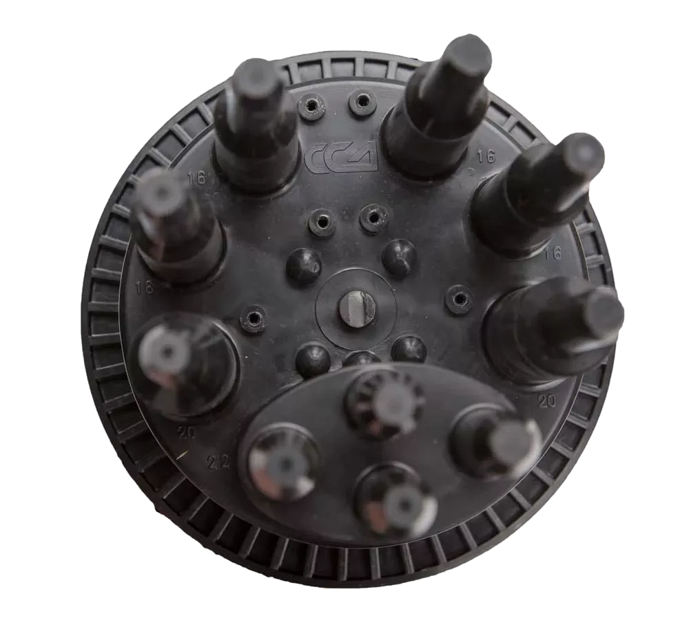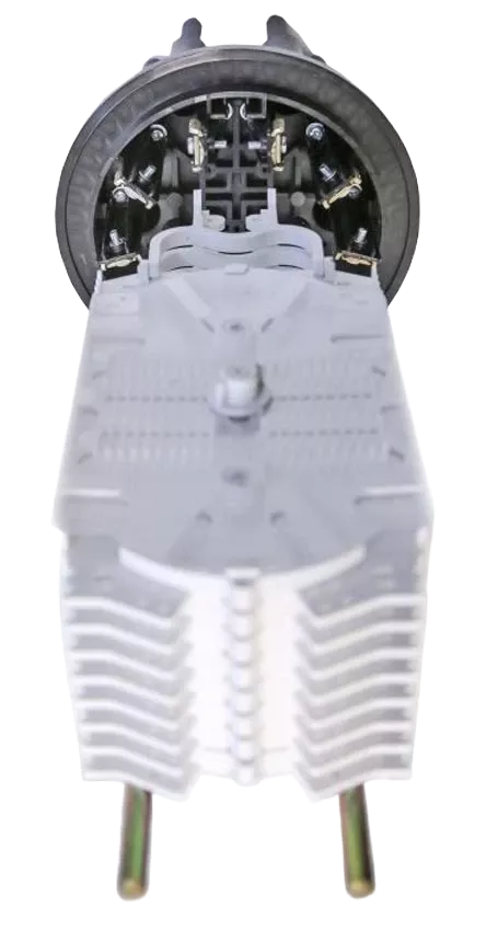 Способ герметизации вводов кабелей, осуществляется с помощью термоусаживаемых трубок ТУТ. Круглые патрубки на оголовнике муфты изначально герметичны и имеют ступенчатую форму с разными диаметрами. Срезая патрубок в определенном месте можно подобрать отверстие максимально близкое к диаметру вводимого кабеля. Таким образом, исключается излишнее натяжение ТУТ после усадки при вводе относительно тонких кабелей. Все патрубки муфты оснащены также индивидуальными узлами крепления ЦСЭ.
