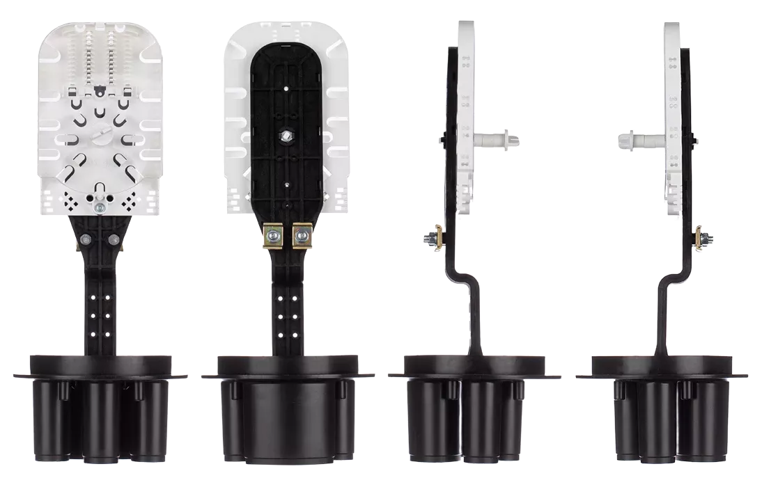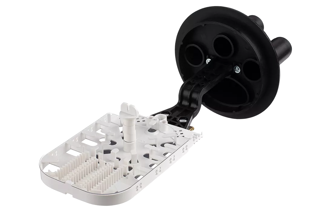 Внутри муфты установлен лоток с кассетой КС-4845 с литым ложементом для 48 сварных соединений, конструкция кассеты позволяет произвести установку до двух оптических планарных мини-разветвителей (с размерами корпуса 60х7х4 мм.), заводить модули с ОВ с двух углов и осуществлять изменение направления укладки запаса волокон.