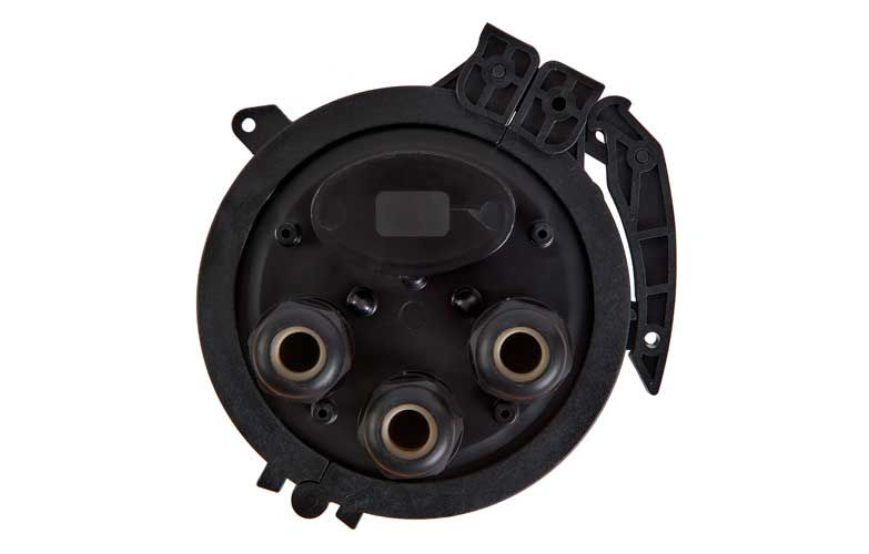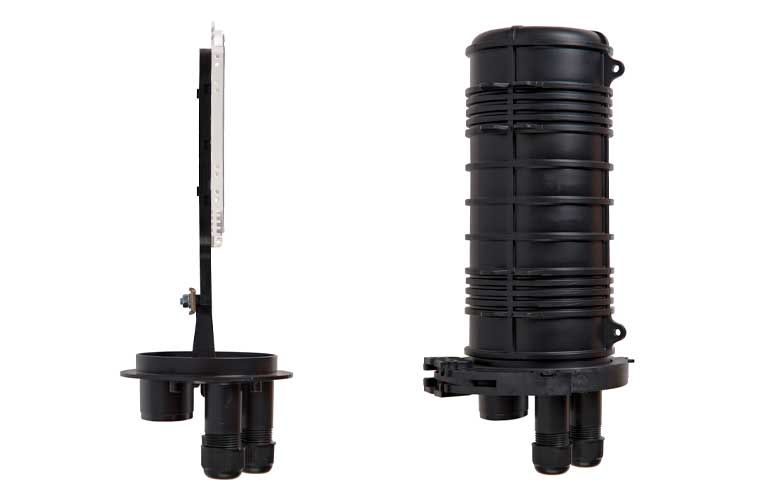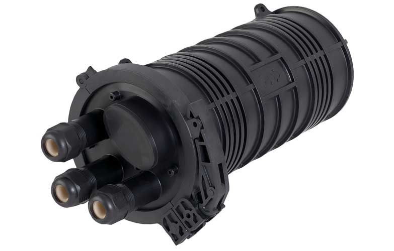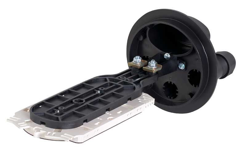 Ввод кабеля, крепление и герметизация осуществляется с помощью резьбовых фитингов, отлитых непосредственно на оголовнике муфты. Муфта имеет три круглых патрубка с фитингами и один овальный, герметизация вводимых кабелей осуществляется также механическим способом. Используя специальные комплекты для ввода в овальный патрубок можно ввести как два отдельных кабеля, так и транзитный. Заглушка овального ввода выламывается при помощи молотка.