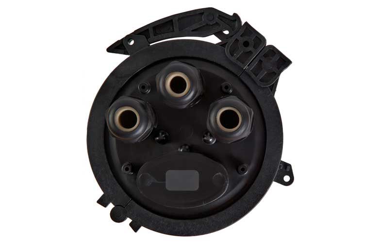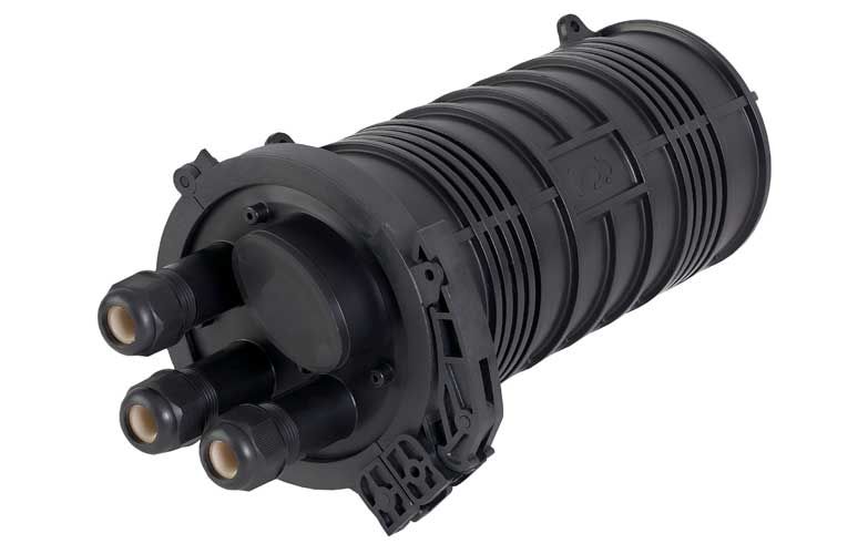Ввод кабеля, крепление и герметизация осуществляется с помощью резьбовых фитингов, отлитых непосредственно на оголовнике муфты. Муфта имеет три круглых патрубка с фитингами и один овальный, герметизация вводимых кабелей осуществляется также механическим способом. Используя специальные комплекты для ввода в овальный патрубок можно ввести как два отдельных кабеля, так и транзитный. Заглушка овального ввода выламывается при помощи молотка.