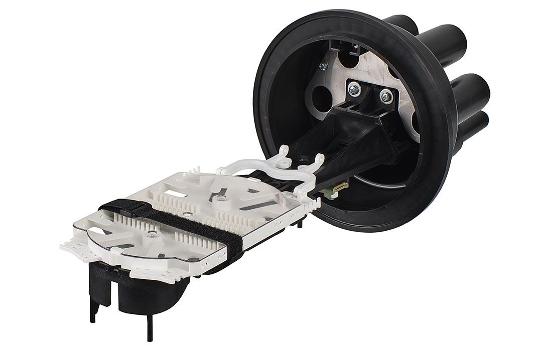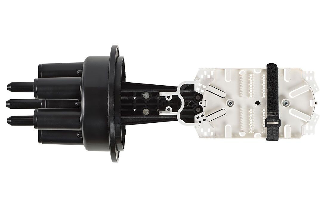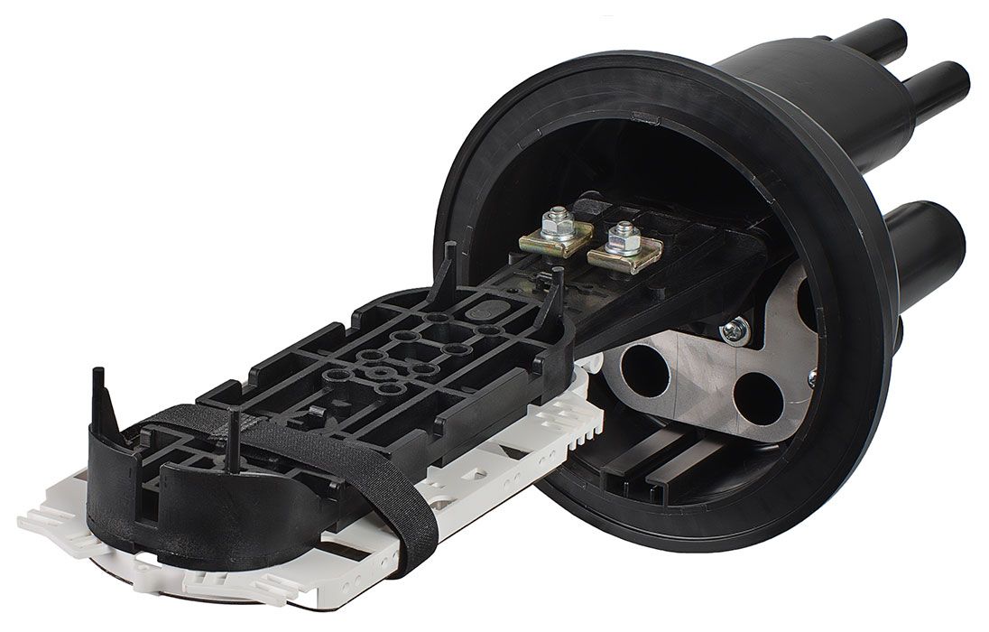 В муфте предусмотрен овальный ввод для транзитной петли оптических модулей без разрезания. Выкладка петли модулей осуществляется на лотке с противоположной стороны от кассет.