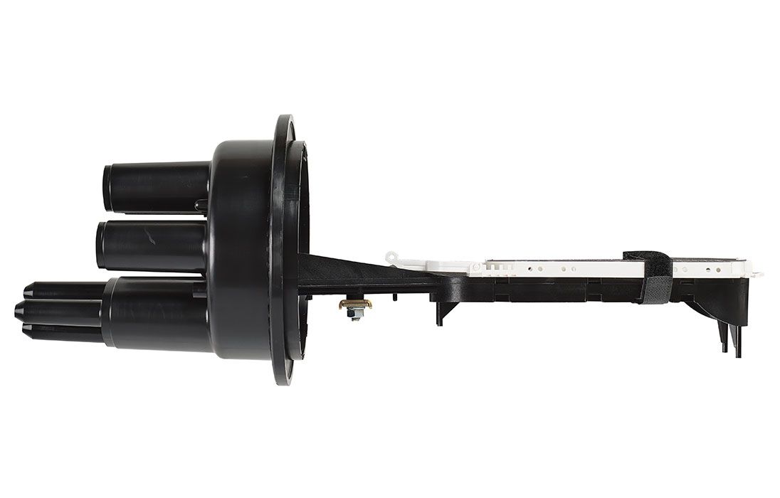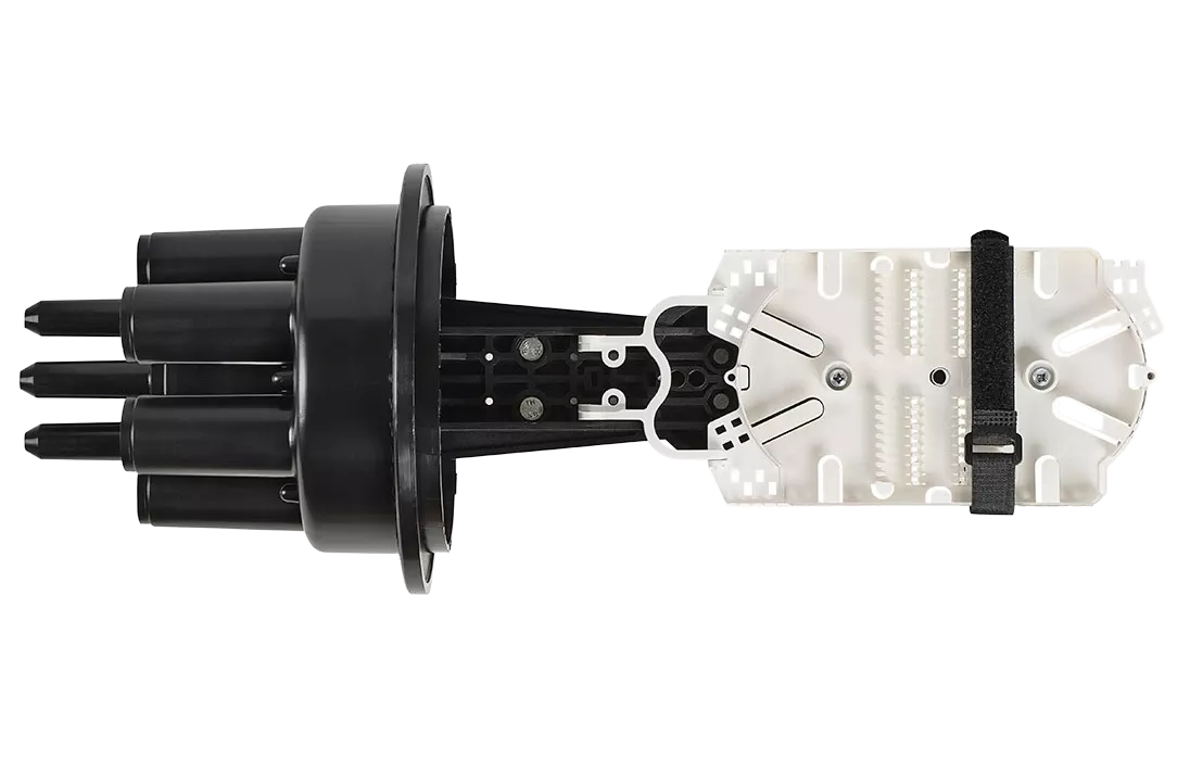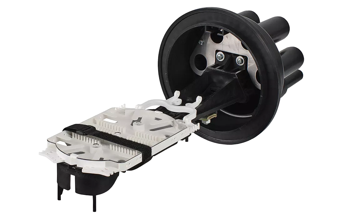 В муфте предусмотрен овальный ввод для транзитной петли оптических модулей без разрезания. Выкладка петли модулей осуществляется на лотке с противоположной стороны от кассет.