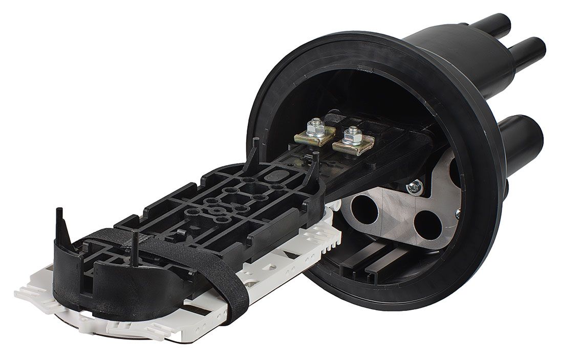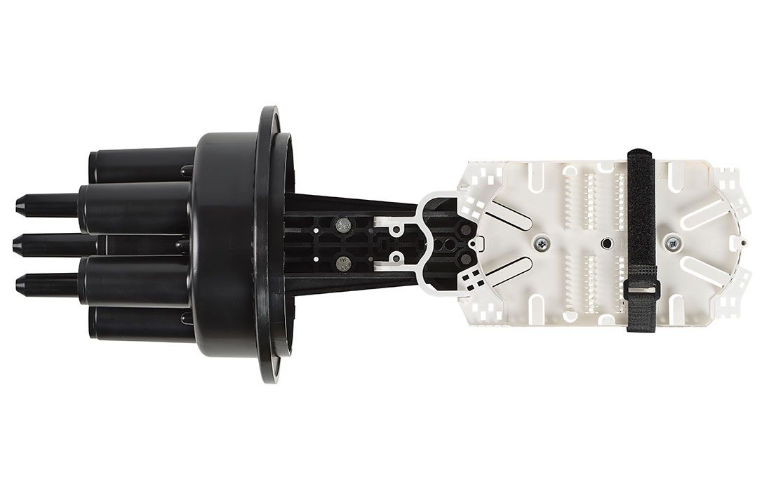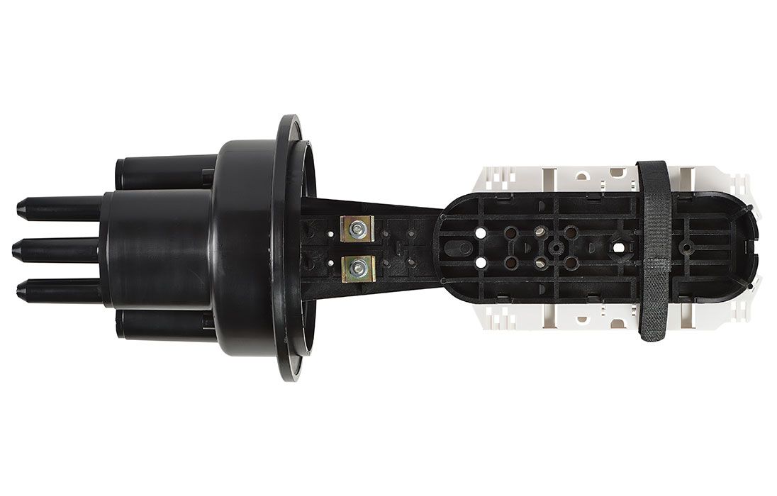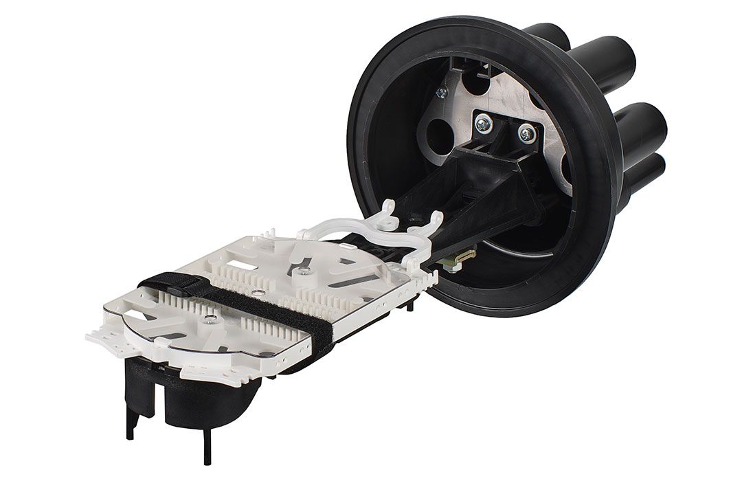 В муфте предусмотрен овальный ввод для транзитной петли оптических модулей без разрезания. Выкладка петли модулей осуществляется на лотке с противоположной стороны от кассет.