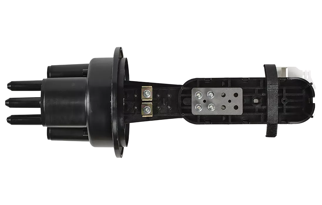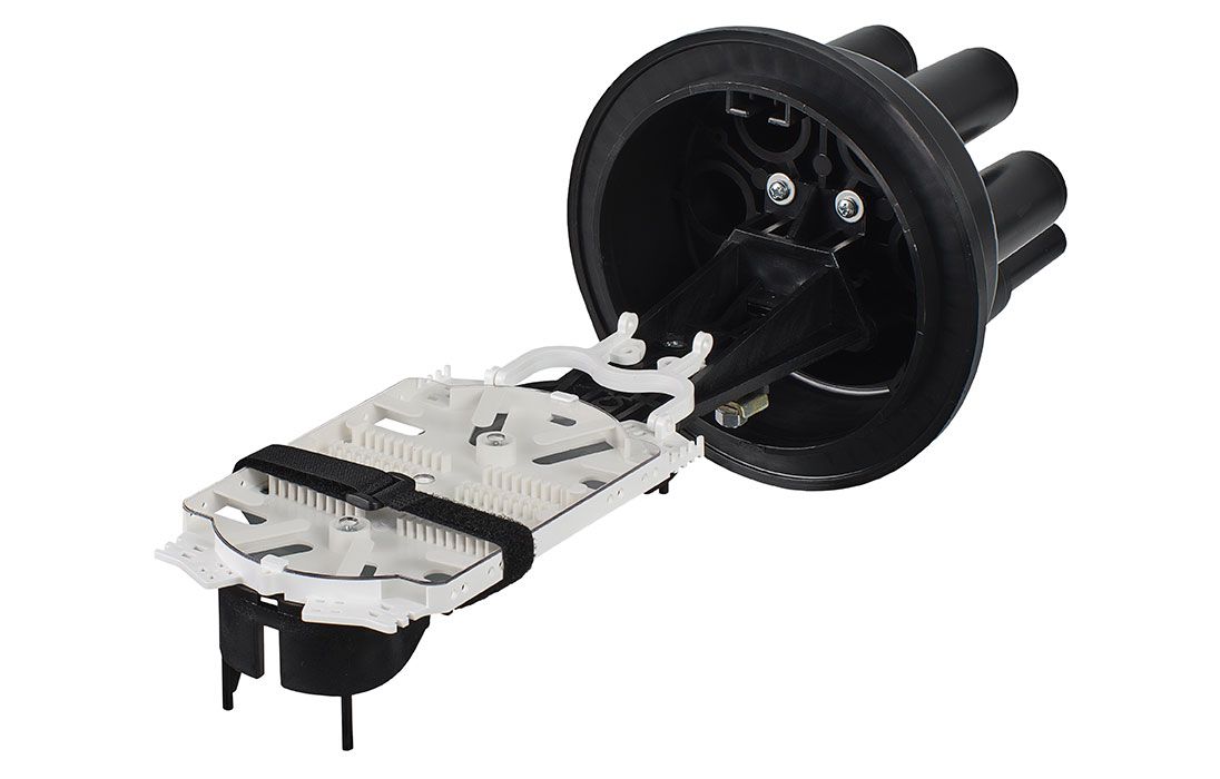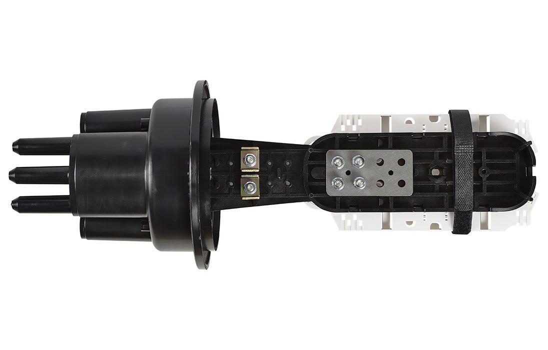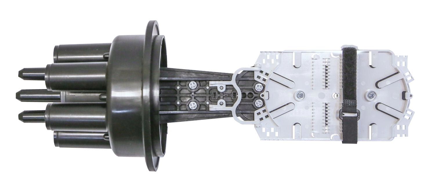 Предназначена для монтажа любого оптического кабеля (кроме подводных). Достигается это за счет использования специальных кабельных вводов, каждый из которых в свою очередь охватывает определенную группу кабелей. В муфте предусмотрен овальный ввод для транзитной петли оптических модулей без разрезания. Выкладка петли модулей осуществляется на лотке с противоположной стороны от кассет.