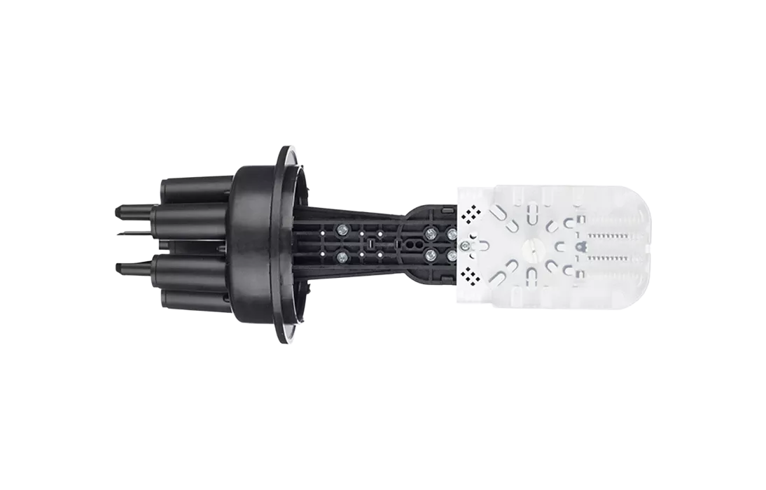 Предназначена для монтажа любого оптического кабеля (кроме подводных). Достигается это за счет использования специальных кабельных вводов, каждый из которых в свою очередь охватывает определенную группу кабелей. В муфте предусмотрен овальный ввод для транзитной петли оптических модулей без разрезания. Выкладка петли модулей осуществляется на лотке с противоположной стороны от кассет.