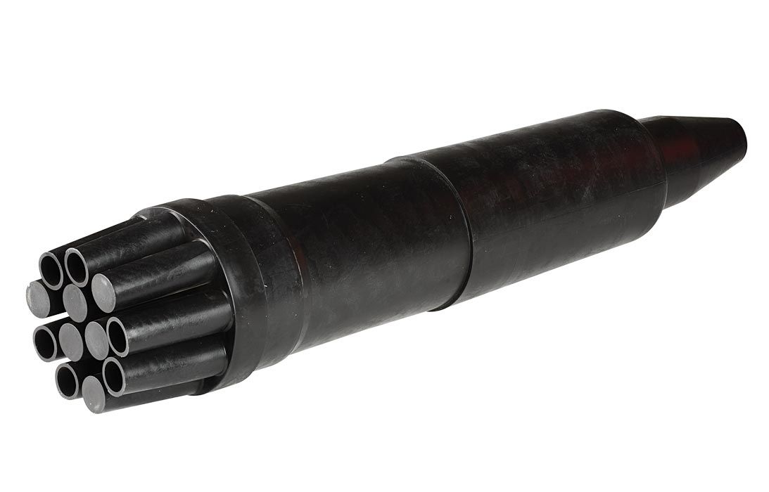 На оголовнике муфты размещены двенадцать патрубков. Шесть из них в состоянии поставки заглушены. Это позволяет использовать муфту в качестве станционной разветвительной муфты с вводом шести, семи, восьми, девяти, десяти, одиннадцати и двенадцати стопарных кабелей ТСВ.