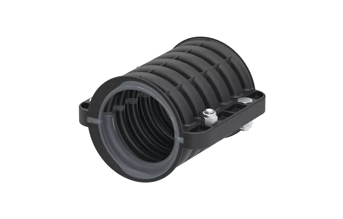 Конструкция состоит из двух половинок, которые соединяются между собой с помощью болтового соединения. Данное решение позволяет осуществлять соединение труб, в которых уже протянут кабель. Может использоваться в качестве «ремонтной муфты» для восстановления поврежденного трубопровода. Такое соединение является прочным и надежным, что исключает риск разрыва трубопровода в процессе эксплуатации при подвижке и просадке грунта, а как же при проведении аварийно-восстановительных работ.