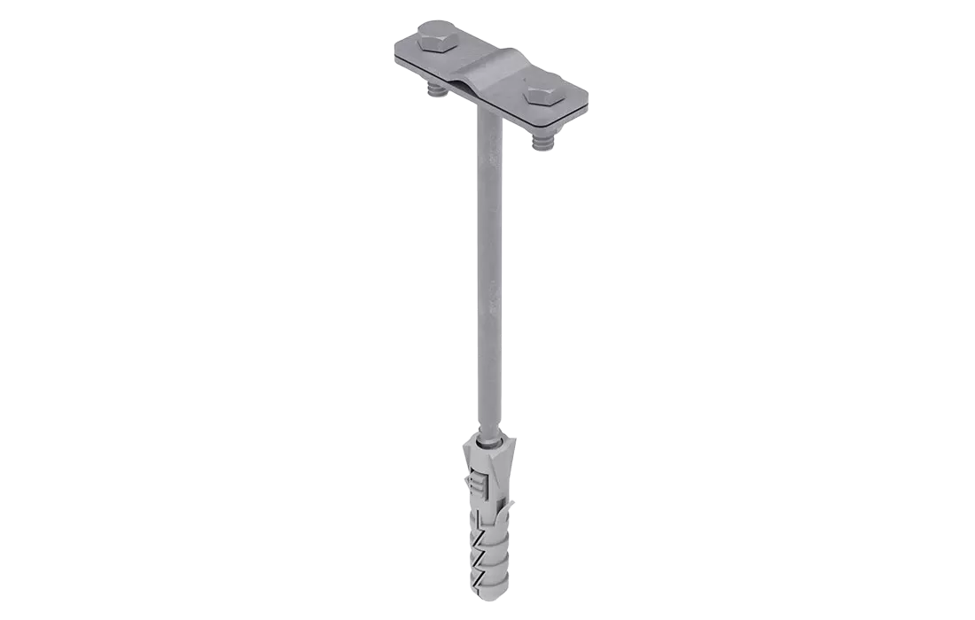 Фасадный держатель служит для установки круглых (8-10 мм) и плоских (25 мм) токоотводов по фасаду здания. Крепление проводника осуществляется с помощью болтового зажима. Длина - 125 мм, изготовлен из горячеоцинкованной стали.