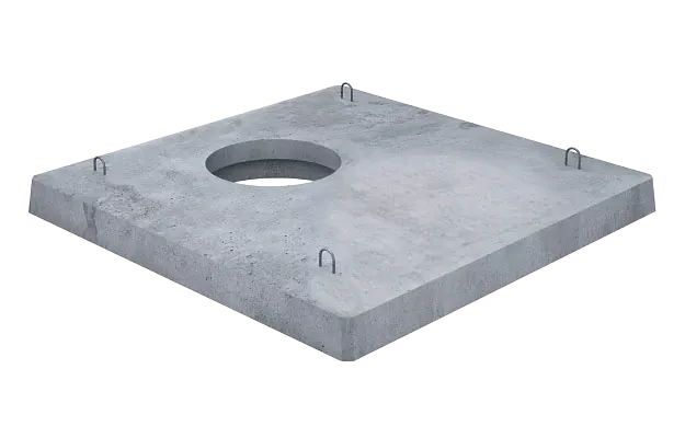 Плита имеет квадратную форму со смещенным относительно центра круглым отверстием для установки люка. На верхней поверхности плиты расположены четыре строповочных петли. Отверстие снизу плиты имеет диаметр 760 мм, которое конусообразно сужается до 600 мм в верхней части плиты. Это создает возможность ввода горловины пластикового колодца внутрь отверстия плиты, с последующим размещением пластиковой крышки колодца или чехла на горловине колодца для дополнительной защиты от воды и грязи. Чтобы исключить давление плиты на горловину колодца при проседании грунта после строительства, ее следует вводить не более чем на треть высоты отверстия плиты.