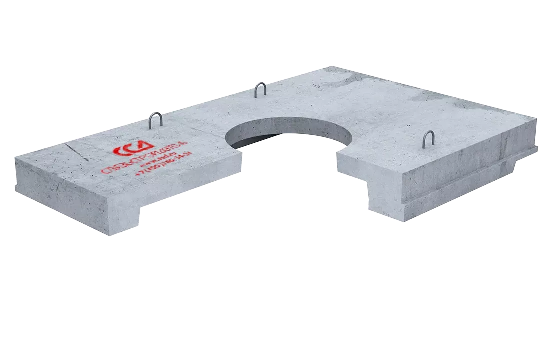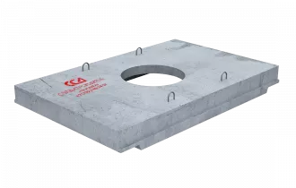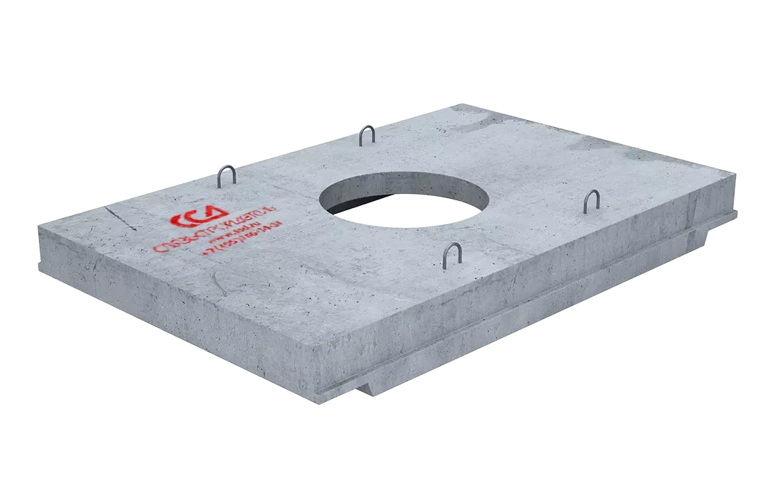 Представляет собой прямоугольную плиту покрытия с выступами на нижней и боковых поверхностях и с отверстием для люка, которая устанавливается на стеновые блоки. Выступ на нижней поверхности плиты находится ниже уровня верхних поверхностей стеновых блоков, что обеспечивает необходимую степень прочности смонтированного колодца. После установки плиты выступы на ее боковых поверхностях образуют пазы, которые заполняются бетоном. Отверстие имеет круглую форму и располагается по центру плиты. На верхней грани плиты имеются четыре петли, обеспечивающие возможность строповки плиты при её погрузке-разгрузке и при опускании плиты на смонтированный корпус колодца. Плита покрытия рассчитана на нормативную нагрузку НК-80. Для идентификации производителя изделия, на внутренней поверхности плиты, в бетоне, отлит логотип ССД.