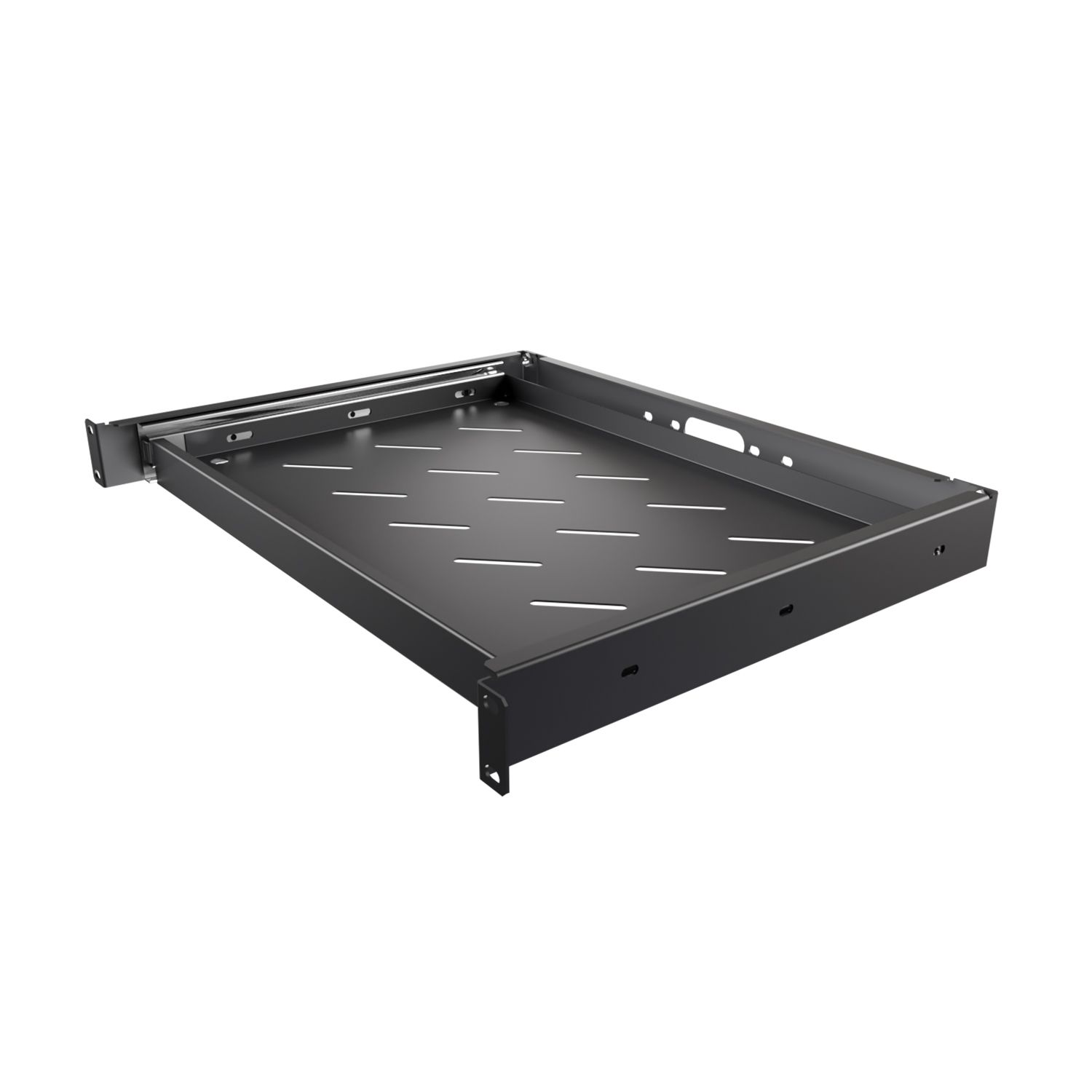 Выдвижная полка для размещения клавиатуры, имеет только передние крепления на 19" профили, что позволяет устанавливать ее в любые телекоммуникационные шкафы как с одной так и с двумя парами 19 профилей.