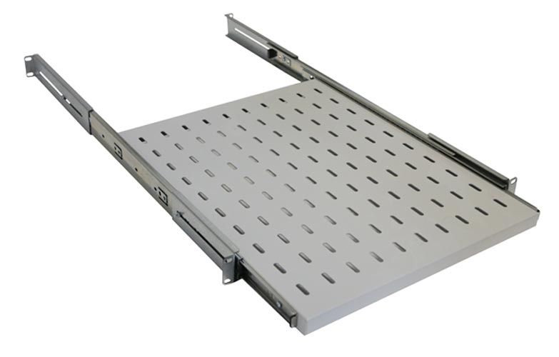 Полка выполнена из металла 1,5 мм, имеет телескопические направляющие, обеспечивающие плавное выдвижение. Монтажные кронштейны фиксируют полку к вертикальным направляющим шкафов и стоек в четырех местах. Глубина монтажных кронштейнов регулируется, что позволяет устанавливать полку на необходимую глубину. Распределительная нагрузка на полку составляет 30 кг.