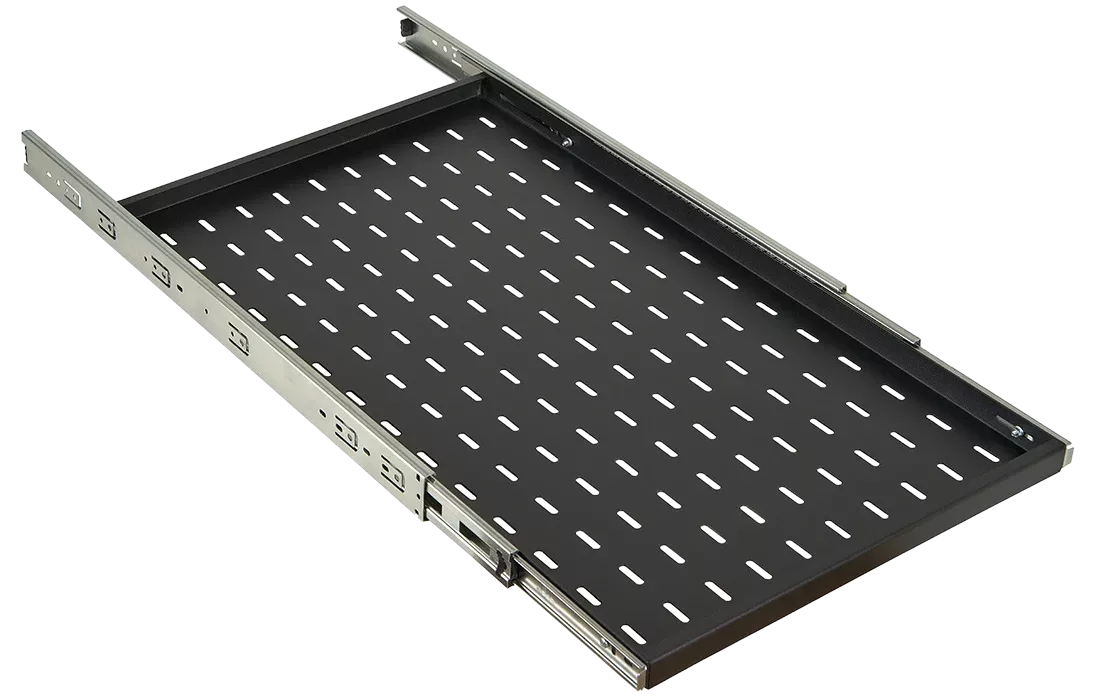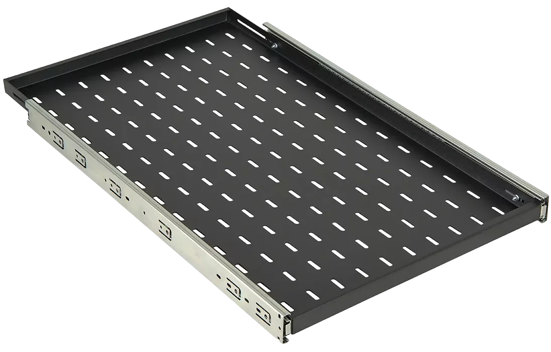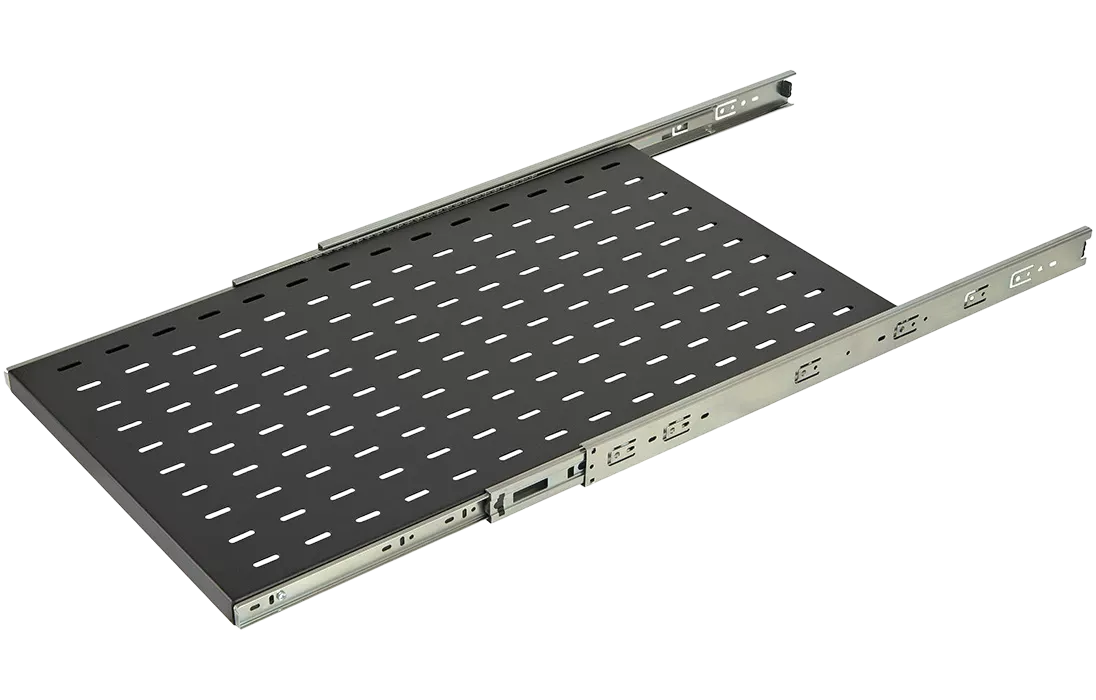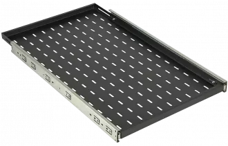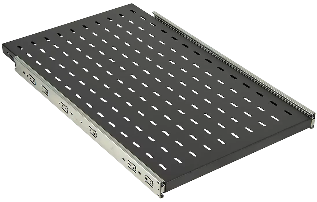 Полка выполнена из металла 1,5 мм, имеет телескопические направляющие, обеспечивающие плавное выдвижение. Монтажные кронштейны фиксируют полку к вертикальным направляющим шкафов и стоек в четырех местах. Глубина монтажных кронштейнов регулируется, что позволяет устанавливать полку на необходимую глубину. Распределительная нагрузка на полку составляет 30 кг.
