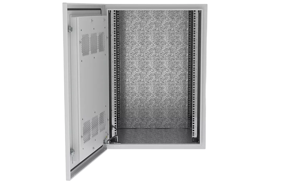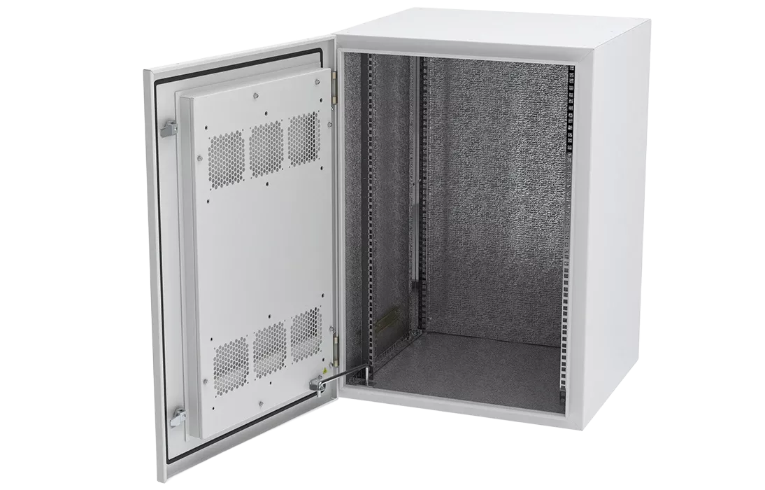 Дверь шкафа двухслойная вентилируемая, внутри установлен фильтр, также имеются места для установки вентиляторного модуля.