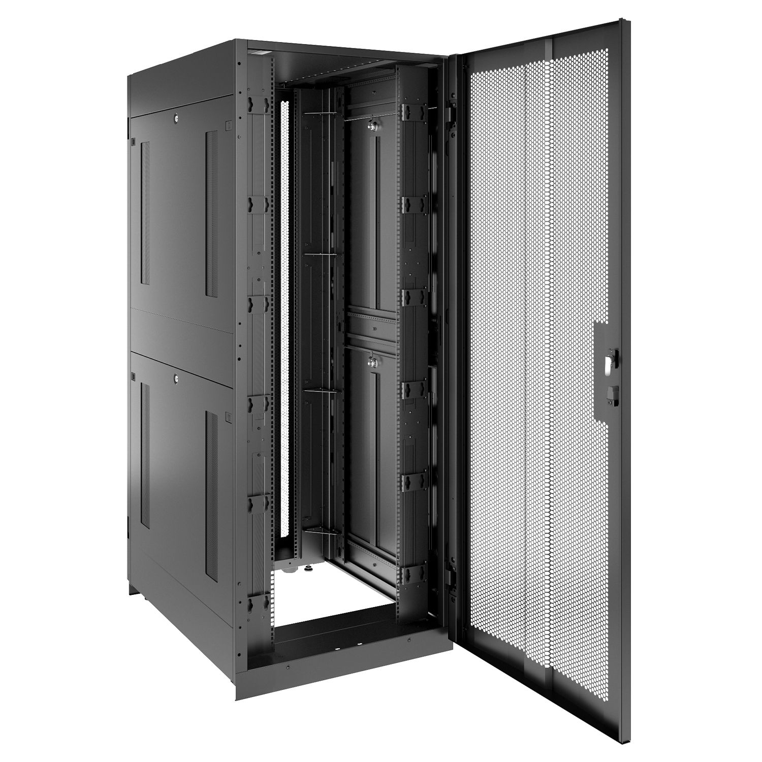 Угол открытия перфорированных передних и задних дверей 180°. Может эксплуатироваться без боковых панелей с полным сохранением функционала. По желанию шкафы могут устанавливаться без ножек и роликов для уменьшения высоты инсталляции без потери нагрузочной способности.