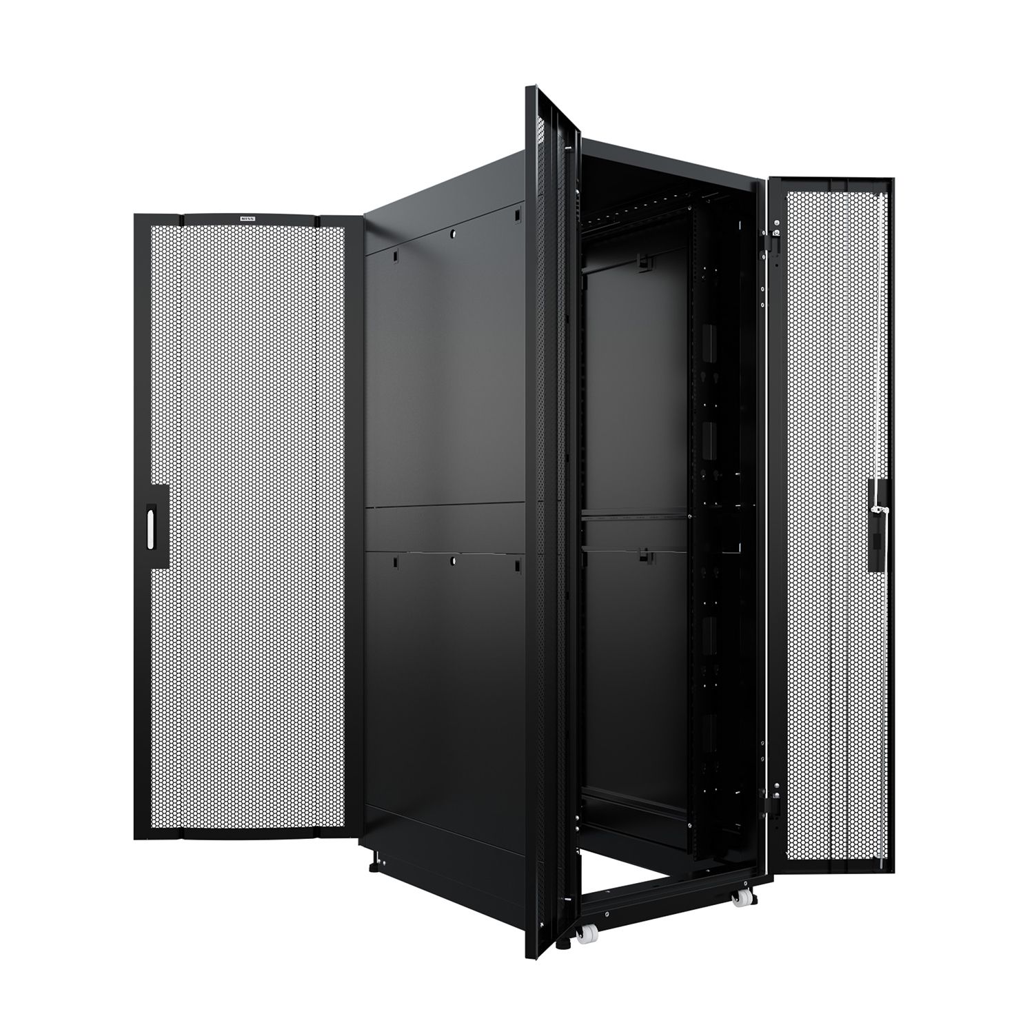 Угол открытия перфорированных передних и задних дверей 180°. Может эксплуатироваться без боковых панелей с полным сохранением функционала. По желанию шкафы могут устанавливаться без ножек и роликов для уменьшения высоты инсталляции без потери нагрузочной способности.
