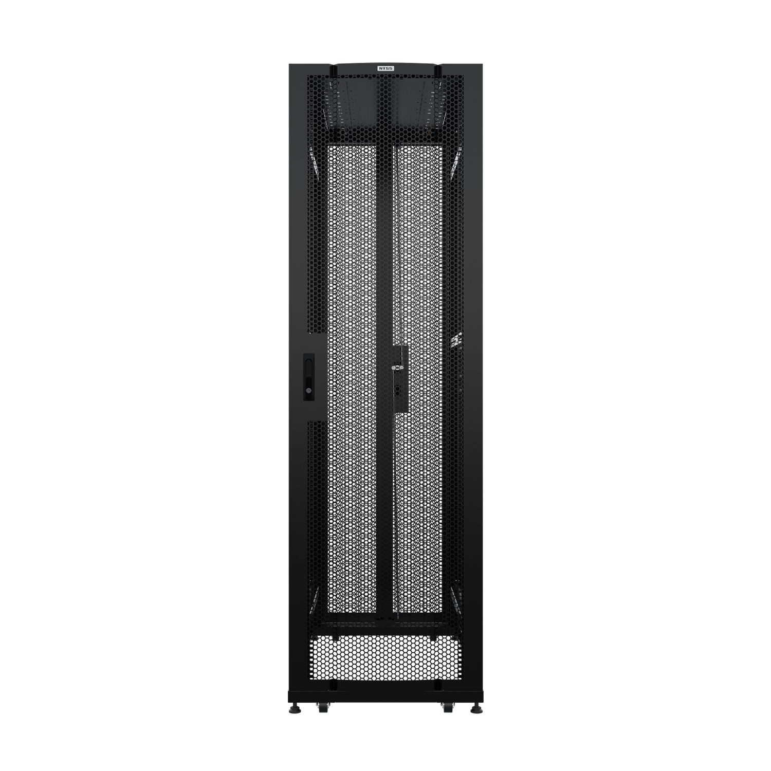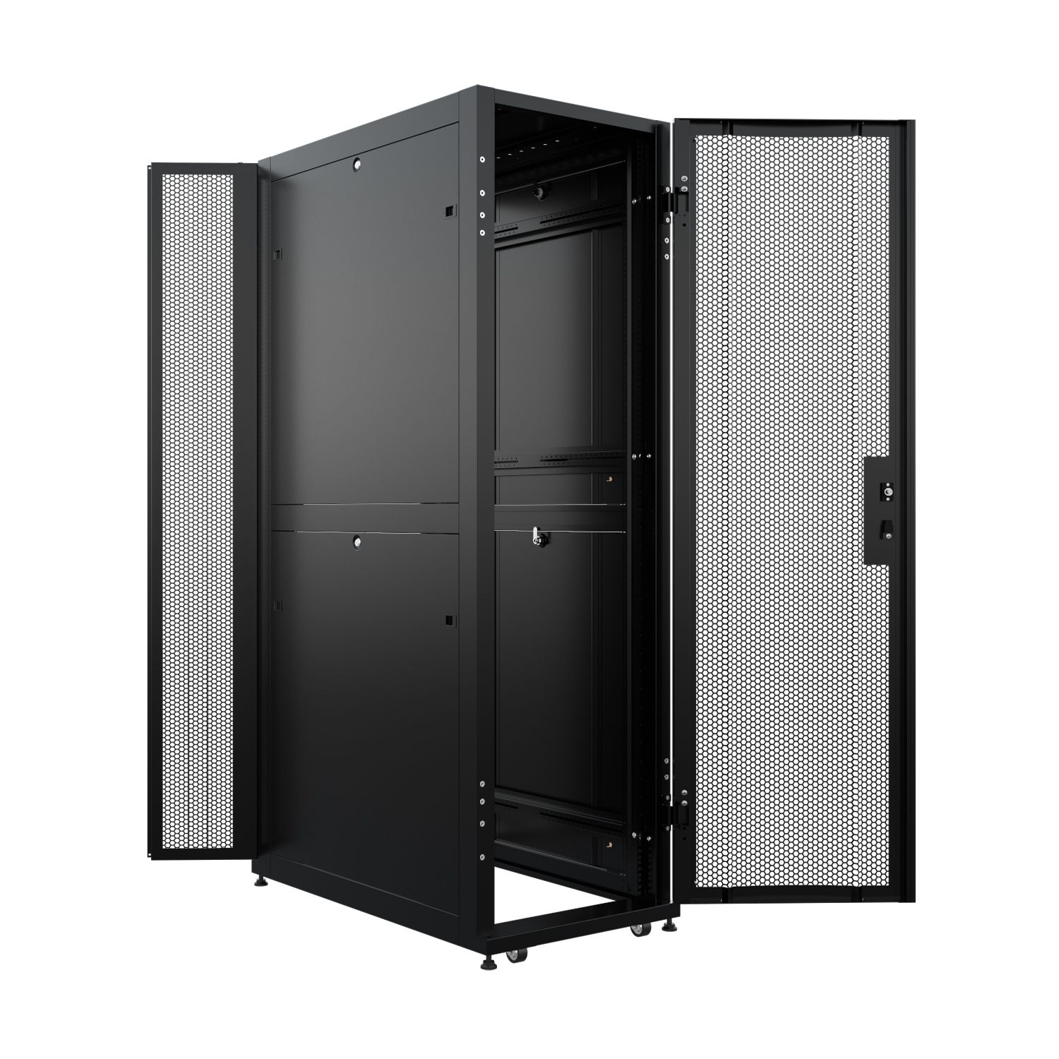 Шкаф напольный серверный NTSS ПРОЦОД DS 48U 600х1070мм, двойные боковые стенки, панель потолка с щеточными вводами, двери перфорированная и перфорированная двухстворчатая, без панели пола, регулируемые опоры, ролики, черный RAL 9005