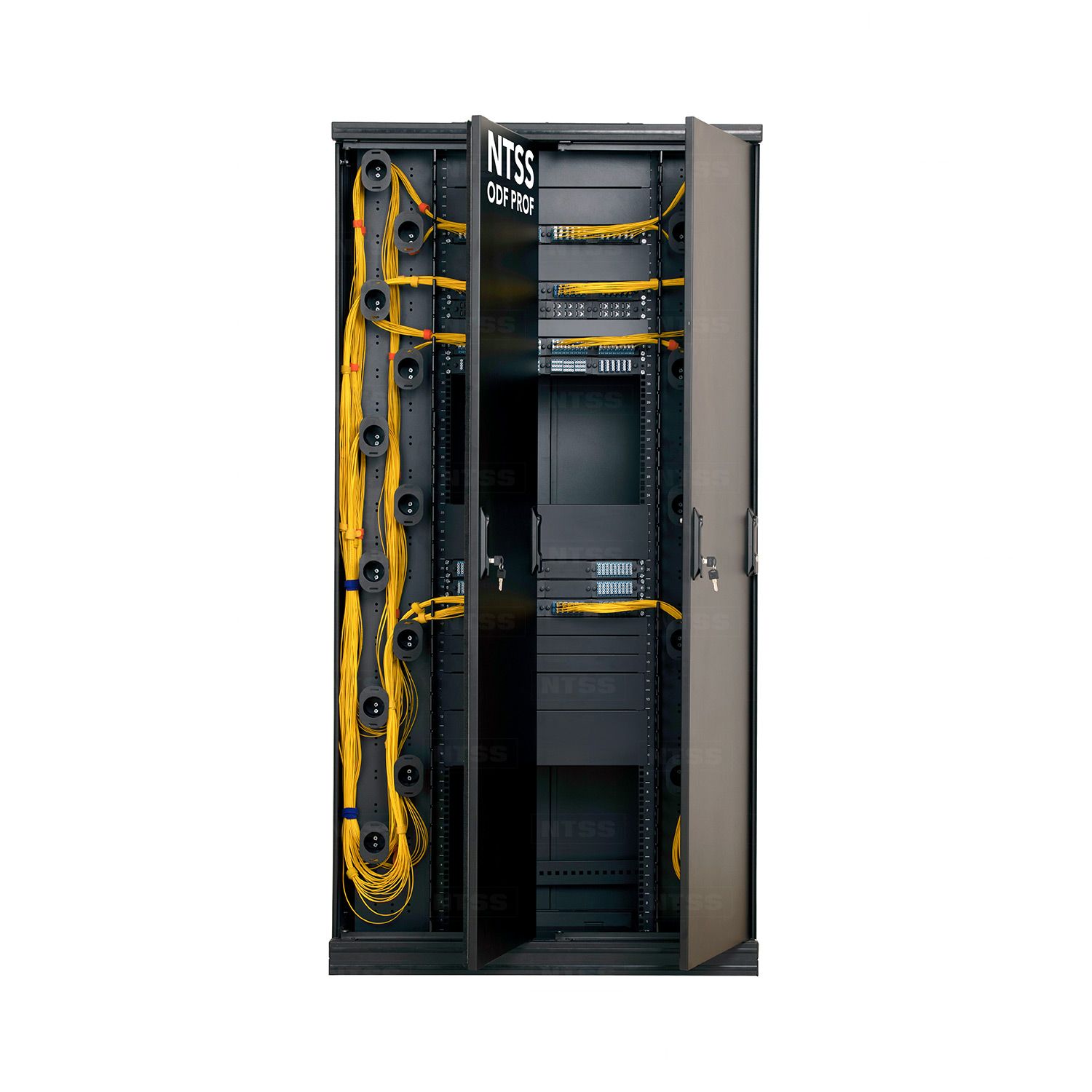 Шкаф высокой плотности NTSS ODF PROF. Размеры шкафа – 42U-54U ШГ шириной от 500 до 1200мм, глубиной от 500 до 800мм. Двойные передние двери с замками, открывающиеся в разные стороны. Съемные боковые панели с возможностью установки кабельных вводов, доступна поставка без боковых стенок для объединения в ряды. Задняя стенка – двойная, съемная, шкафы могут объединятся как с боковой стороны так и спина к спине. В крышу и дно шкафа могут быть установлены щеточные кабельные вводы. Дно шкафа выполнено из съемных панелей. 19-ти дюймовые направляющие могут перемещаться по глубине шкафа, а также по горизонтали. Пальцевые органайзеры для отвода патч-кордов и для ввода кабелей в кроссы.