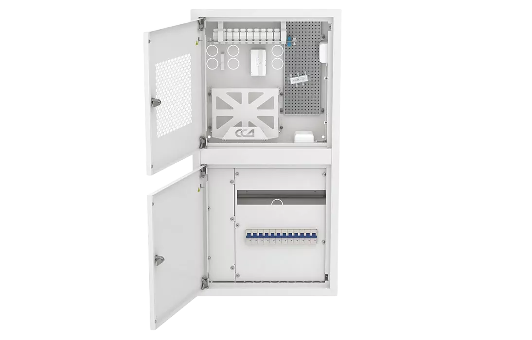 Шкаф квартирный телекоммуникационный встраиваемый двухсекционный представляет собой двухсекционный корпус и внешний лючок, состоящий из накладной рамки с двумя дверцами из стали толщиной 1,0 мм.