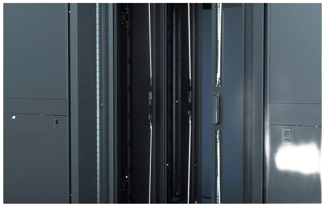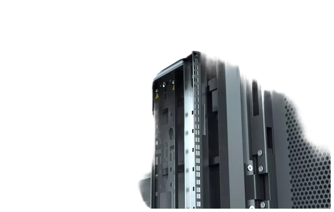 Доступ для монтажа, коммутации и обслуживания оборудования возможен с четырех сторон: через боковые стенки, переднюю и заднюю двери. В базовой комплектации шкаф имеет 4 вертикальные направляющие, регулируемые по глубине с юнитовой разметкой, вертикальные органайзеры.