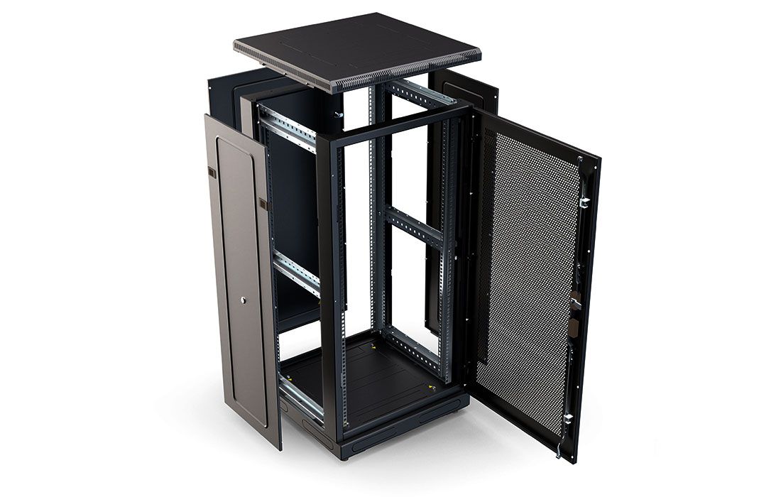 За счет элементов крепления каркас шкафа имеет повышенную жесткость. Распределенная вертикальная нагрузка до 800 кг. Стандартно шкаф комплектуется: передней дверью, боковыми и задней стенками с замками.