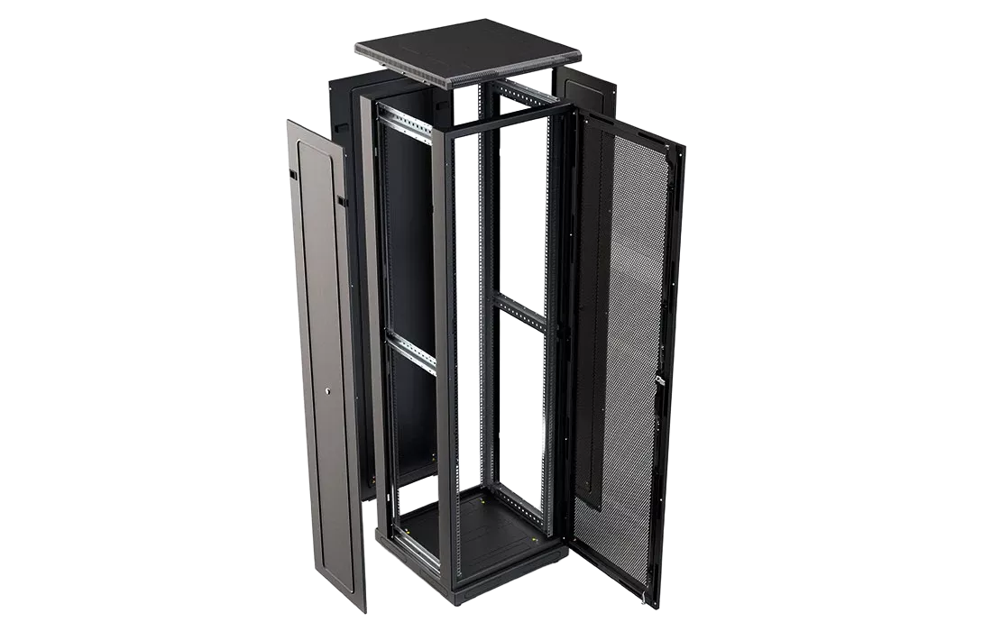 За счет элементов крепления каркас шкафа имеет повышенную жесткость. Распределенная вертикальная нагрузка до 800 кг. Стандартно шкаф комплектуется: передней дверью, боковыми и задней стенками с замками.