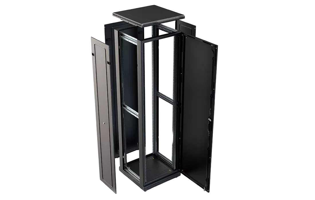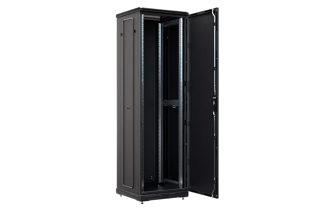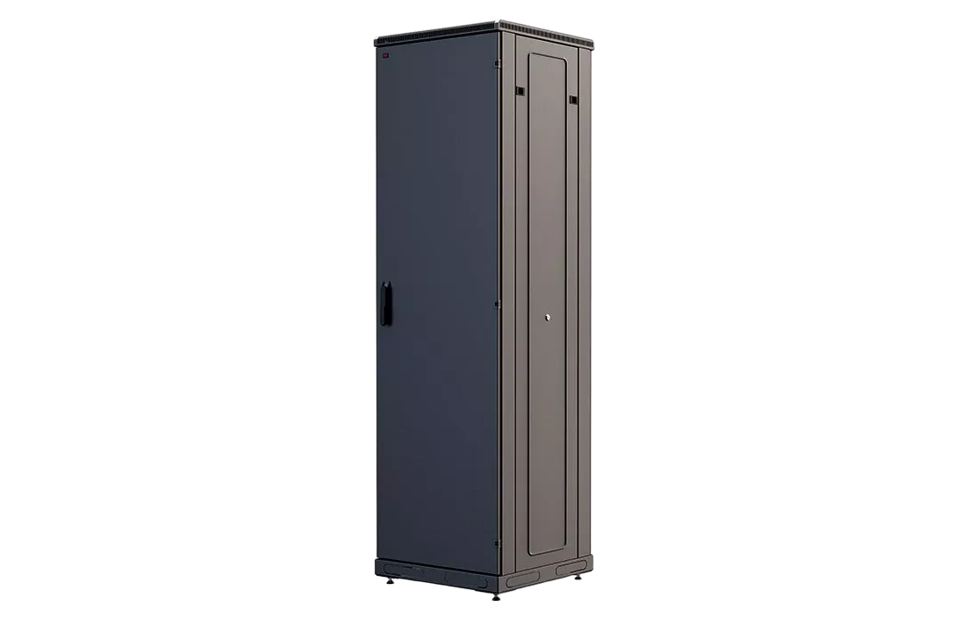 За счет элементов крепления каркас шкафа имеет повышенную жесткость. Распределенная вертикальная нагрузка до 800 кг. Стандартно шкаф комплектуется: передней дверью, боковыми и задней стенками с замками.
