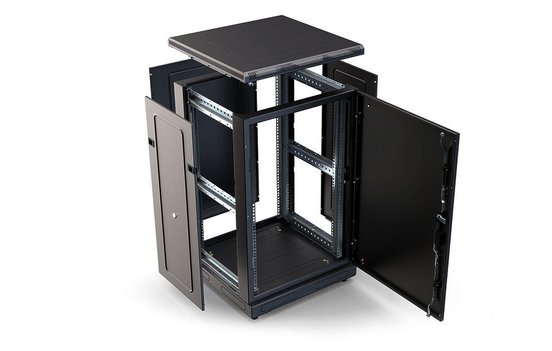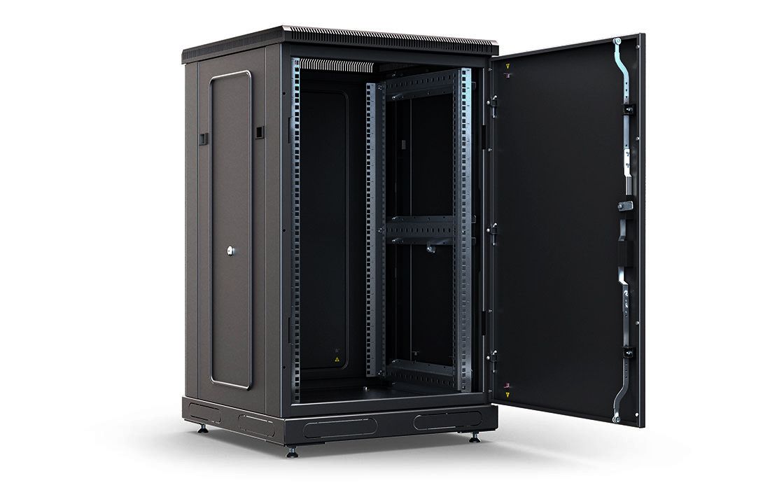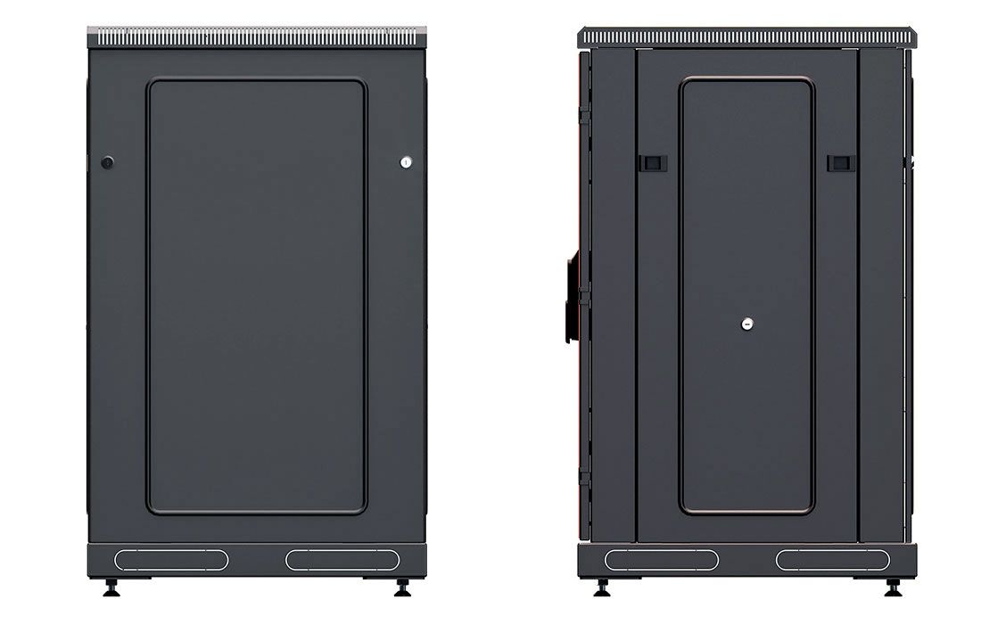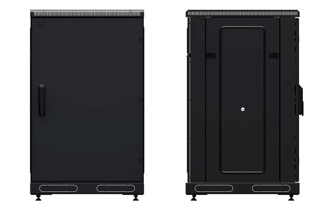 За счет элементов крепления каркас шкафа имеет повышенную жесткость. Распределенная вертикальная нагрузка до 800 кг. Стандартно шкаф комплектуется: передней дверью, боковыми и задней стенками с замками.