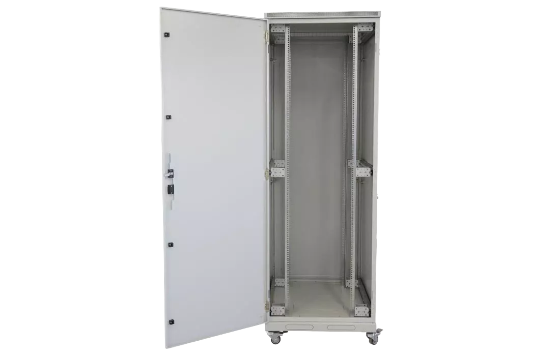 За счет элементов крепления каркас шкафа имеет повышенную жесткость. Распределенная вертикальная нагрузка до 600 кг. Стандартно шкаф комплектуется передней дверью, боковыми и задней стенками с замками.