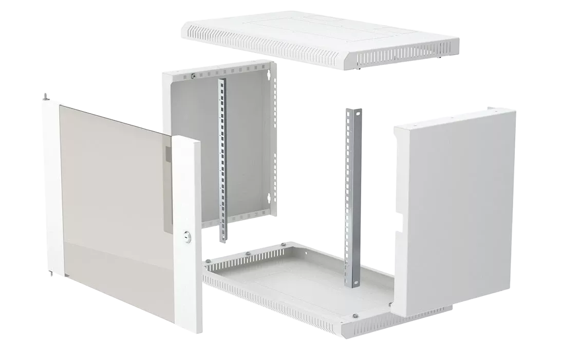 Имеет полностью разборную конструкцию и состоит из шести основных частей: крыша, дно, две боковые стенки с вертикальными направляющими, дверь, задняя стенка* и две передние направляющие. За счет элементов крепления каркас шкафа имеет повышенную жесткость. Комплектация шкафа возможна с несколькими исполнениями двери-металлической, перфорированной и с каленым ударопрочным, тонированным стеклом. Предусмотрены два кабельных ввода в верхней и нижней частях шкафа, размер – 100х50 мм. В основание или крышу шкафа возможна установка вентиляторного модуля. Для установки модуля демонтируется заглушка, и модуль фиксируется шестью винтами. Вертикальные направляющие регулируются по глубине. Система заземления шкафа входит в стандартную комплектацию.