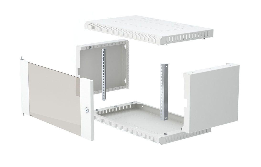 Имеет полностью разборную конструкцию и состоит из шести основных частей: крыша, дно, две боковые стенки с вертикальными направляющими, дверь, задняя стенка* и две передние направляющие. За счет элементов крепления каркас шкафа имеет повышенную жесткость. Комплектация шкафа возможна с несколькими исполнениями двери-металлической, перфорированной и с каленым ударопрочным, тонированным стеклом. Предусмотрены два кабельных ввода в верхней и нижней частях шкафа, размер – 100х50 мм. В основание или крышу шкафа возможна установка вентиляторного модуля. Для установки модуля демонтируется заглушка, и модуль фиксируется шестью винтами. Вертикальные направляющие регулируются по глубине. Система заземления шкафа входит в стандартную комплектацию.