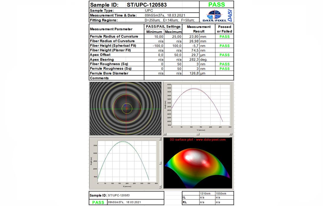 Высокое качество оптических шнуров серии ССД HS гарантируется 100% контролем качества оптических параметров шнуров. Типовое качество полировки торца ферулы приведено на фото с экрана интерферометра.