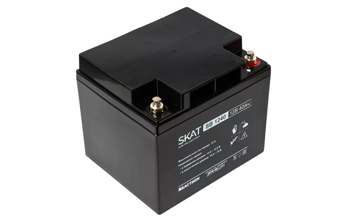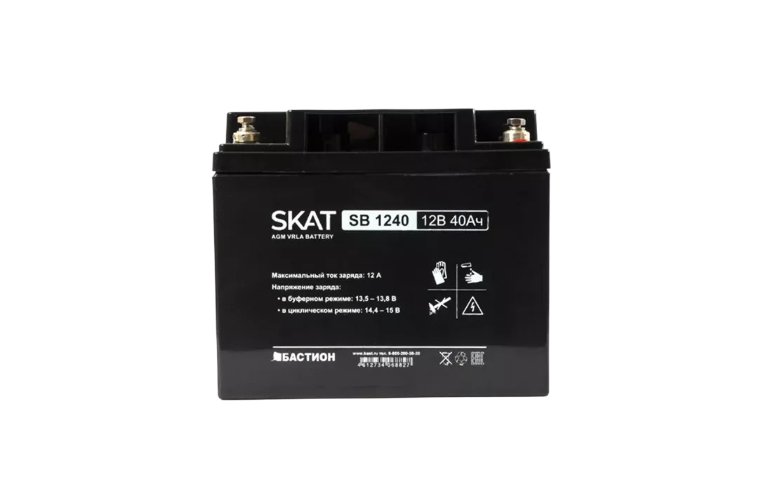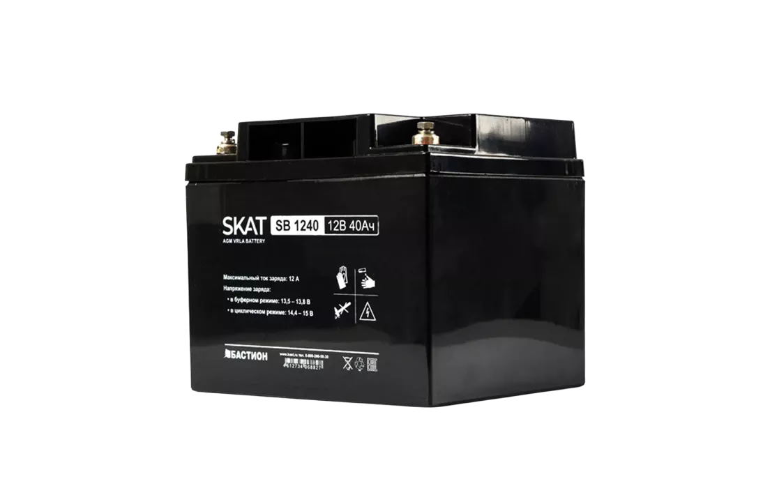Аккумулятор герметичный свинцово-кислотный необслуживаемый SKAT SB 1240 производится по технологии AGM (Absorbent Glass Mat) с системой рекомбинации газов VLRA и предназначен для использования в составе системы резервного питания.