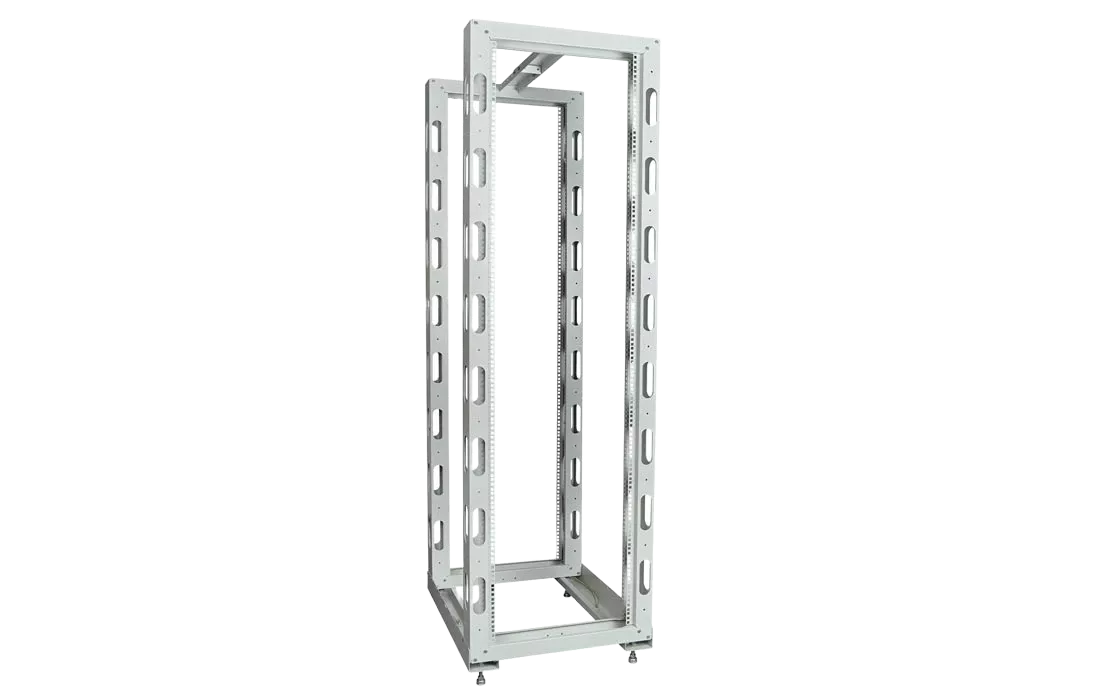 Универсальные стойки 19" имеют полностью разборную двухрамную конструкцию, каркас повышенной жесткости скреплен болтами, материал сталь 2 мм и 1.5 мм. Для удобства монтажа и коммутации оборудования предусмотрена перфорация по всей длине рамы, широкий спектр аксессуаров. Двухрамная универсальная стойка 19" имеет регулировку полезной глубины – 750 мм, 650 мм, 550 мм, 450 мм. Возможно крепление стоек между собой через вертикальный кабельный органайзер. Стойка устанавливается на регулируемые винтовые опоры (ножки), компенсирующие неровности пола, или ролики.