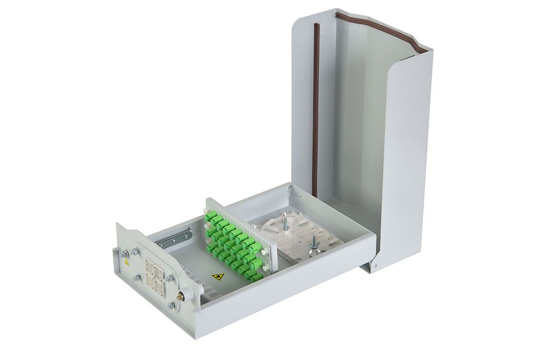 Корпус изготовлен из металла и окрашен порошковой краской. Внутри корпуса установлена кассета для сварки оптических волокон и адаптерные планки для размещения адаптеров SC типа.