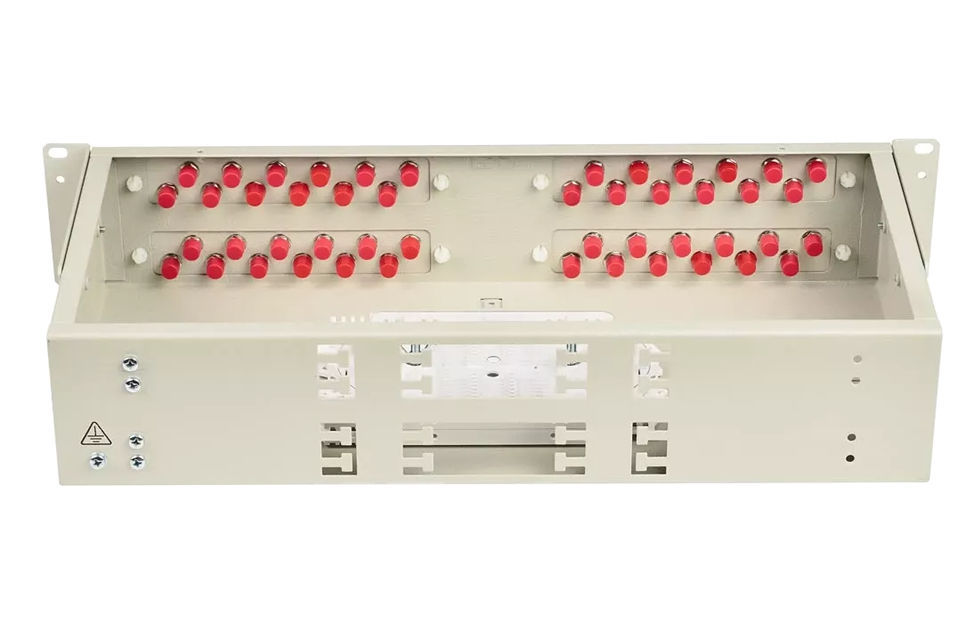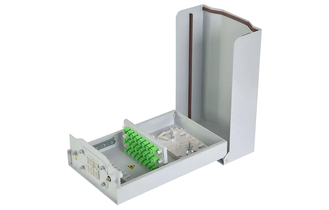 Корпус изготовлен из металла и окрашен порошковой краской. Внутри корпуса установлена кассета для сварки оптических волокон и адаптерные планки для размещения адаптеров SC типа.