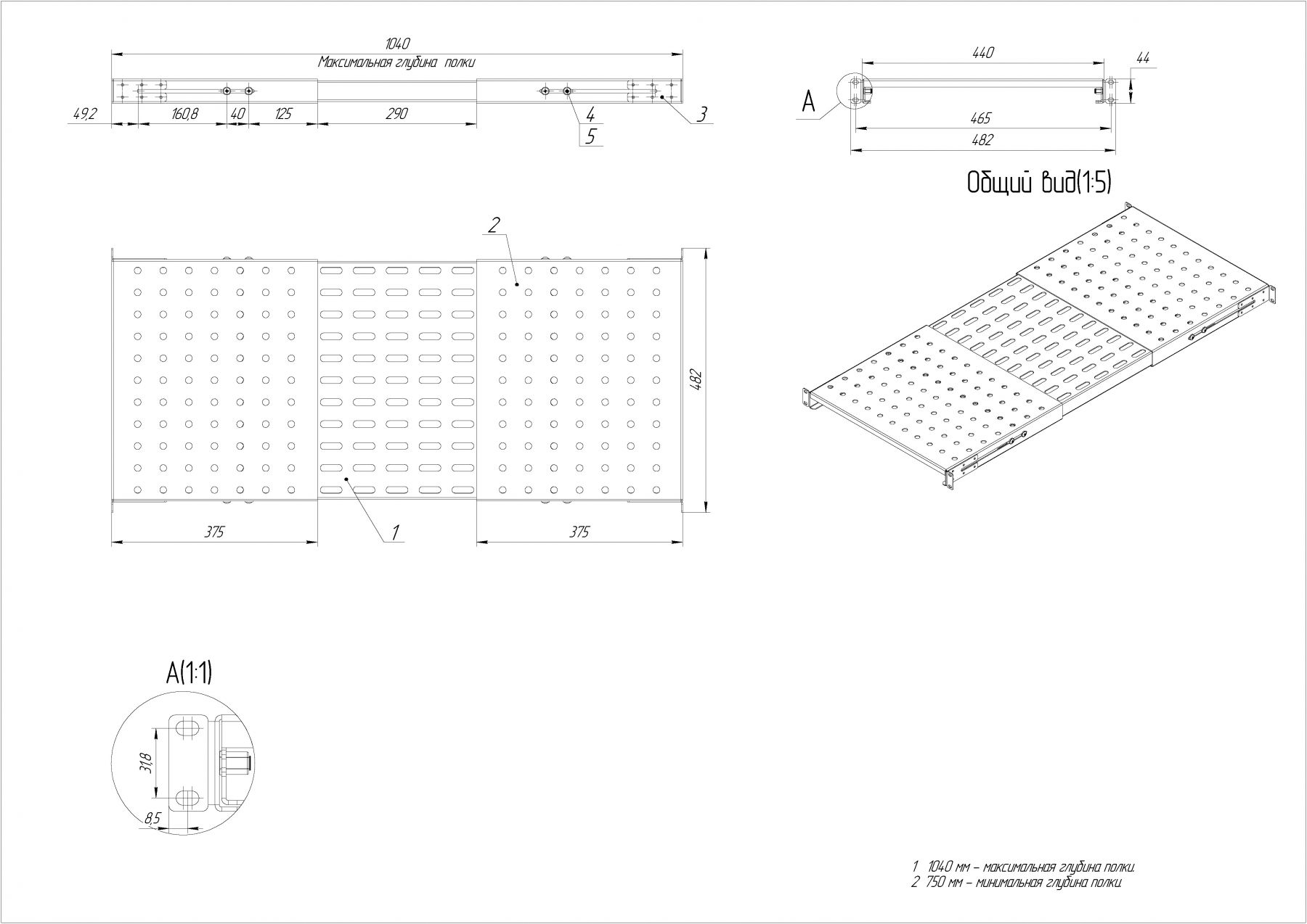 Универсальная полка 1U для шкафов глубиной 1070/1200мм раздвижная (усиленная до 150кг), RAL 9005