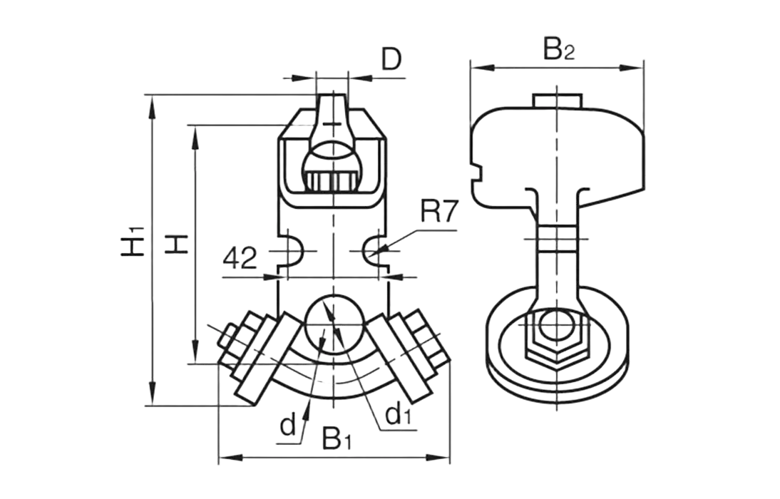 Ушко специальное с гнутым пальцем предназначено для соединения стержня подвесного изолятора или серьги с другой линейной арматурой.