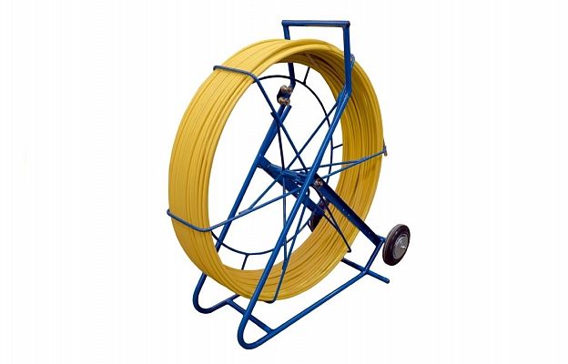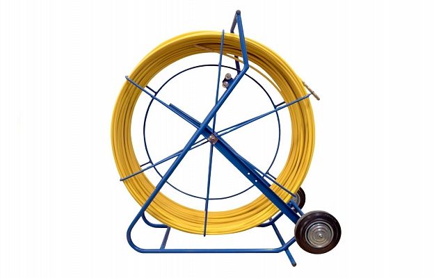 Устройство для заготовки каналов (УЗК) представляет собой тележку на колесах с закрепленным на оси барабаном, в который заправлен стеклопластиковый пруток. Стеклопластиковый пруток в барабане находится в напряженном состоянии. Барабан вращается вокруг своей оси и имеет зажимной винт, с помощью которого происходит его остановка при вращении. Для фиксации и направленного введения рабочего конца стеклопластикового прутка в канал, в верхней части вертикальной рамы тележки располагаются направляющие ролики. В нижней части рамы, с двух сторон, имеются отверстия, в которые при необходимости можно дополнительно установить комплект роликов (приобретается дополнительно). В основании рамы установлены два колеса, а верхняя часть рамы выполнена в виде эргономичной ручки. Стеклопластиковый пруток изготовлен из специальных стеклопластиковых нитей и связывающих компонентов на основе эпоксидной смолы. Снаружи пруток имеет полиэтиленовое покрытие. На концах стеклопластикового прутка расположены наконечники с резьбой М12 и коушами. Одним концом пруток закреплен на барабане.