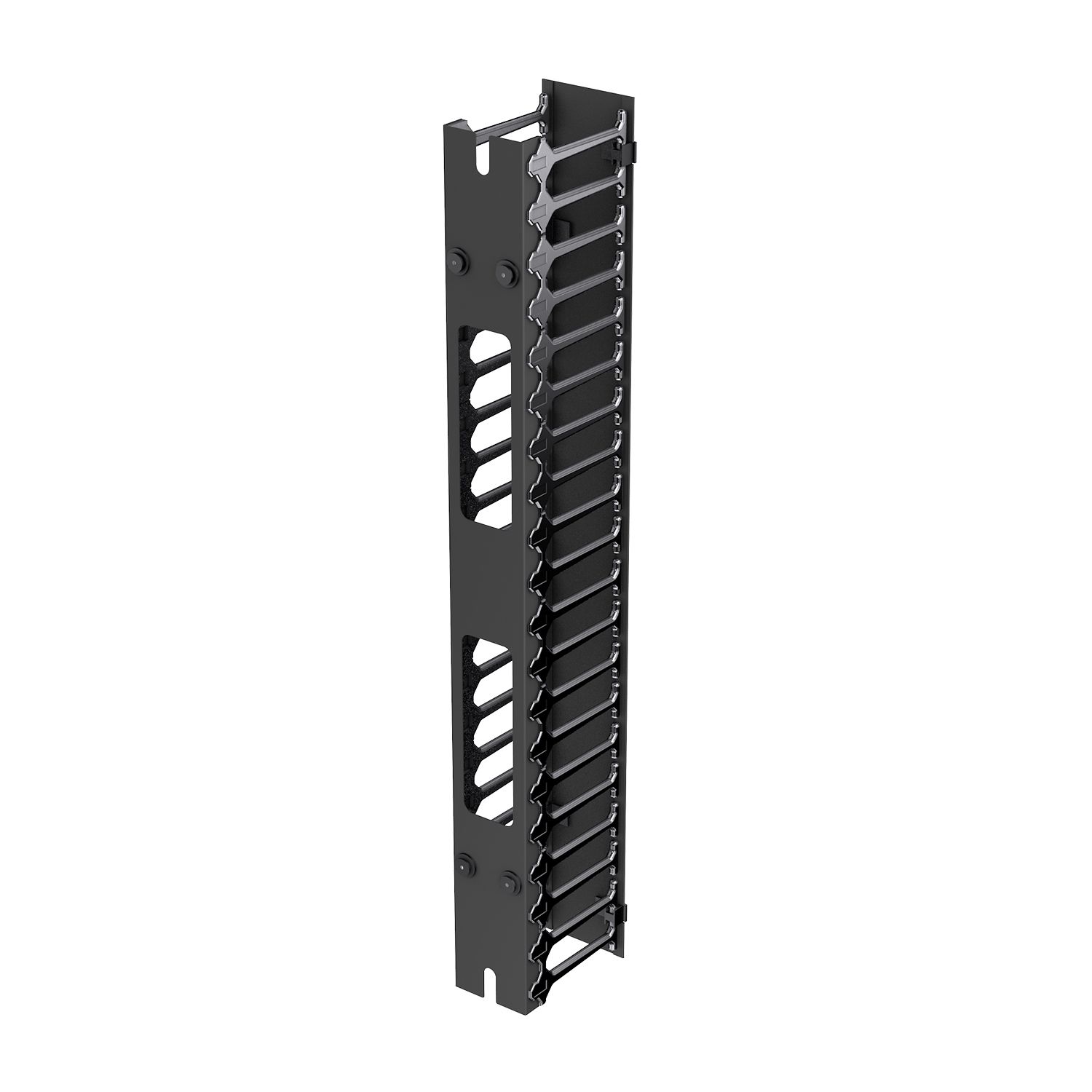 Вертикальный кабельный органайзер NTSS с пластиковым пальцами и крышкой Zero-U предназначен для распределения кабельных потоков. Сегменты пластиковых пальцев на стальном основании со стальной крышкой предназначены для защиты и организации медных и оптических патч-кордов. Может устанавливаться на лоток для Zero-U или на фронтальную поверхность 19" профилей в шкафах ПРОЦОД шириной 800 мм. Схема установки и крепления совпадает со всеми аксессуарами Zero-U. Основные кабельные потоки переносятся из зоны активного оборудования в переднюю и боковые зоны пространства шкафов. Устанавливается без использования инструмента.