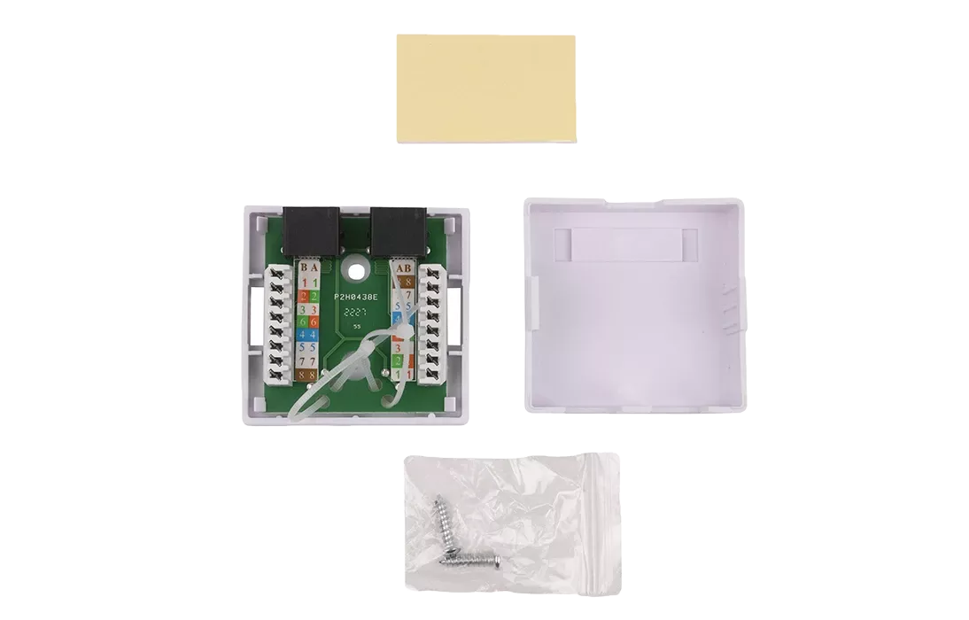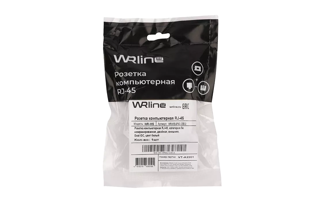 Неэкранированная компьютерная розетка настенного монтажа. Соответствует характеристикам категории 5е. Имеет 2 порта RJ-45 (8р8с). На печатной плате установлены контакты типа Dual IDC с цветной маркировкой по двум стандартам: T568 А и B. Ножи контактов располагаются под 45°, что лучше сказывается на передаточных характеристиках разъема. Для заделки проводников подходят ножи тип 110 и Krone. В комплект розетки входит двусторонняя клеевая площадка, винты для крепления к стене и стяжки для фиксации кабелей в розетке.