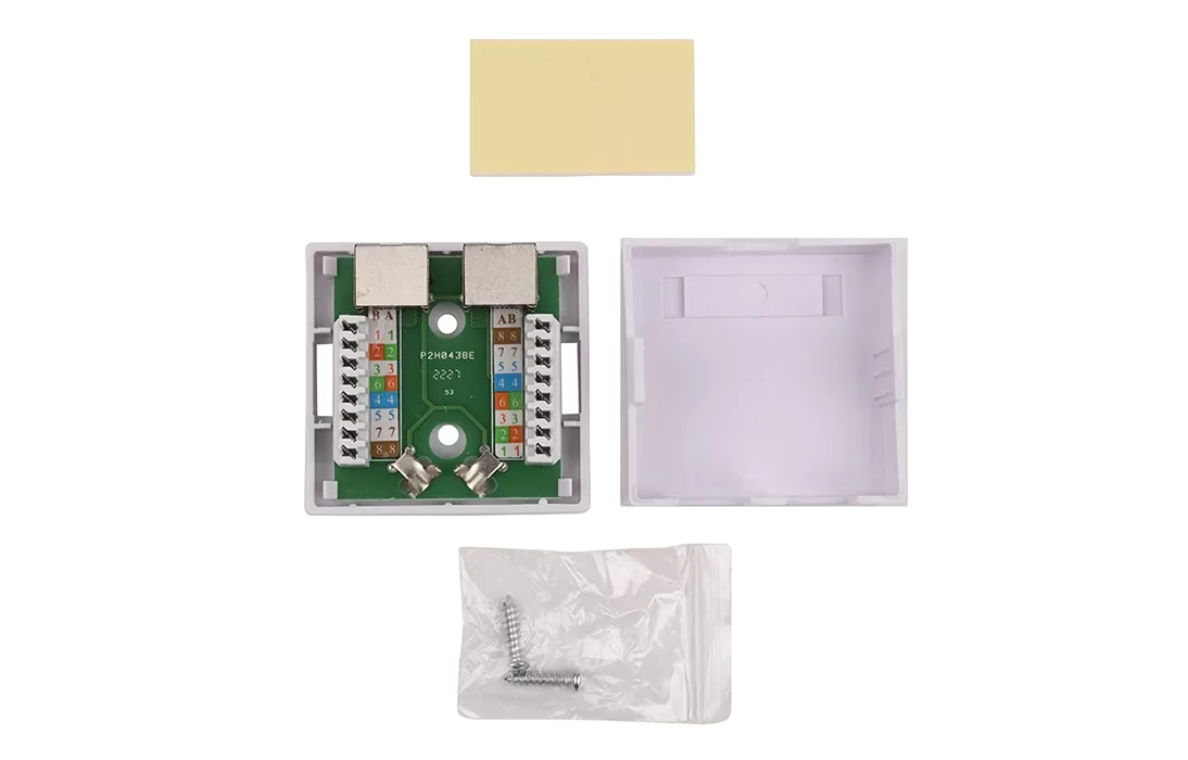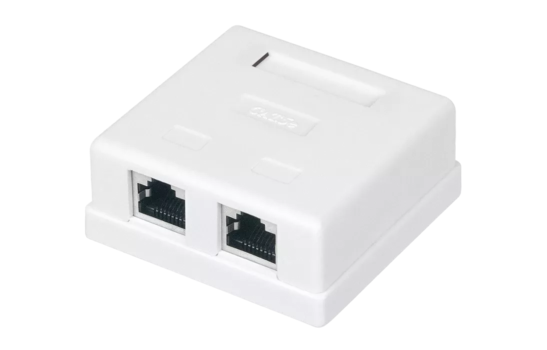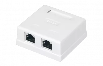 Экранированная компьютерная розетка настенного монтажа. Соответствует характеристикам категории 5е. Имеет 2 порта RJ-45 (8р8с). На печатной плате установлены контакты типа Dual IDC с цветной маркировкой по двум стандартам: T568 А и B. Ножи контактов располагаются под 45°, что лучше сказывается на передаточных характеристиках разъема. Для заделки проводников подходят ножи тип 110 и Krone. Для фиксации экрана кабеля предусмотрены специальные металлические зажимы. В комплект розетки входит двусторонняя клеевая площадка и винты для крепления к стене.